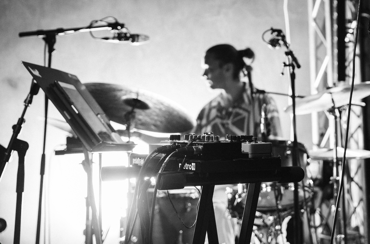 Being a drummer and also responsible for the harmonic input by using my hands to trigger sounds on the sample pad, I can feel an increase of awareness of the rhythmical impulses from the harmonic section and also integrate the digital sounds into my drum kit playing. For example, the sound of a high-mid synth pad with long sustain is working in the same frequency field and texture as my cymbals. Being in control of both these sounds allows me to make different musical choices. As I am able to work directly with them as complementary sounds and avoid possible clashes, creating more richness, nuance and artistic intention in that frequency register.