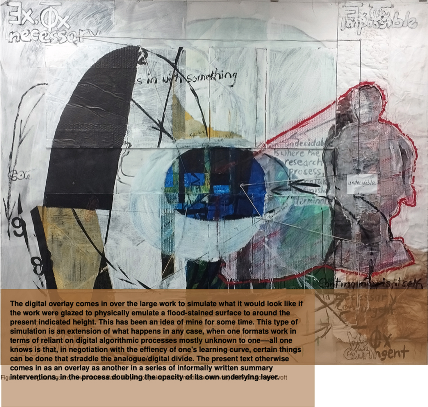 The digital overlay comes in over the large work to simulate what it would look like if the work were glazed to physically emulate a flood-stained surface to around the present indicated height. This has been an idea of mine for some time. This type of simulation is an extension of what happens in any case, when one formats work in terms of reliant on digital algorithmic processes mostly unknown to one––all one knows is that, in negotiation with the effiency of one's learning curve, certain things can be done that straddle the analogue/digital divide. The present text otherwise comes in as an overlay as another in a series of informally written summary interventions, in the process doubling the opacity of its own underlying layer.