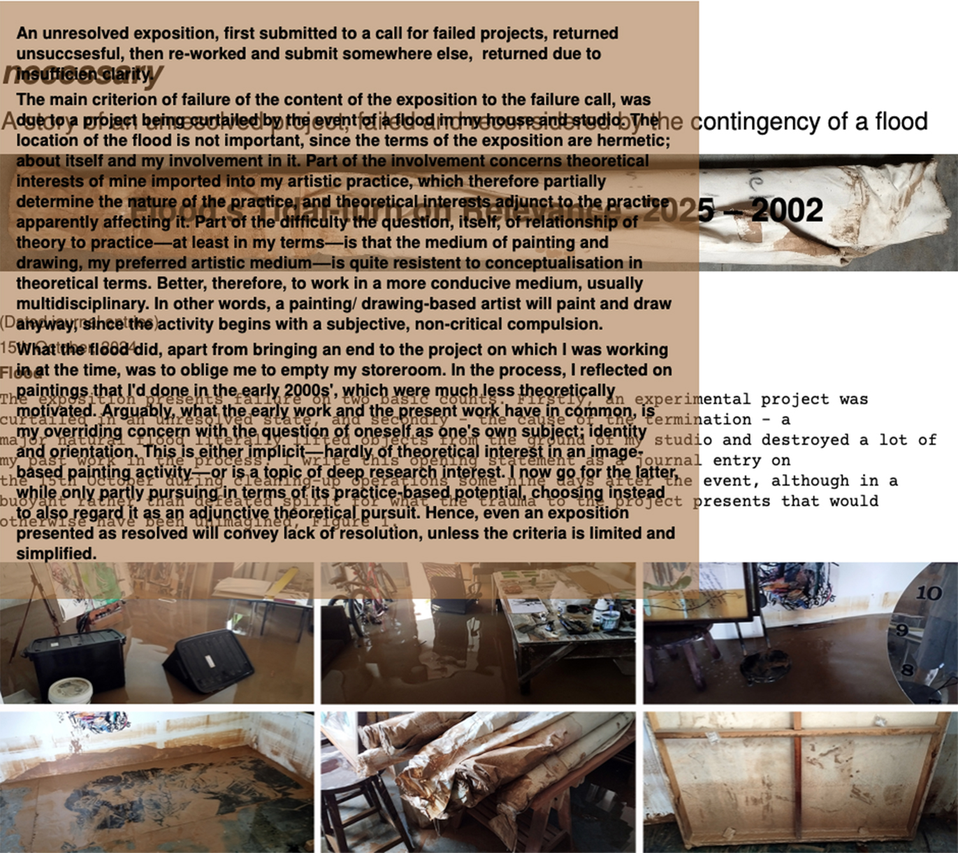 The main criterion of failure of the content of the exposition to the failure call, was due to a project being curtailed by the event of a flood in my house and studio. The location of the flood is not important, since the terms of the exposition are hermetic; about itself and my involvement in it. Part of the involvement concerns theoretical interests of mine imported into my artistic practice, which therefore partially determine the nature of the practice, and theoretical interests adjunct to the practice apparently affecting it. Part of the difficulty the question, itself, of relationship of theory to practice––at least in my terms––is that the medium of painting and drawing, my preferred artistic medium––is quite resistent to conceptualisation in theoretical terms. Better, therefore, to work in a more conducive medium, usually multidisciplinary. In other words, a painting/ drawing-based artist will paint and draw anyway, since the activity begins with a subjective, non-critical compulsion.