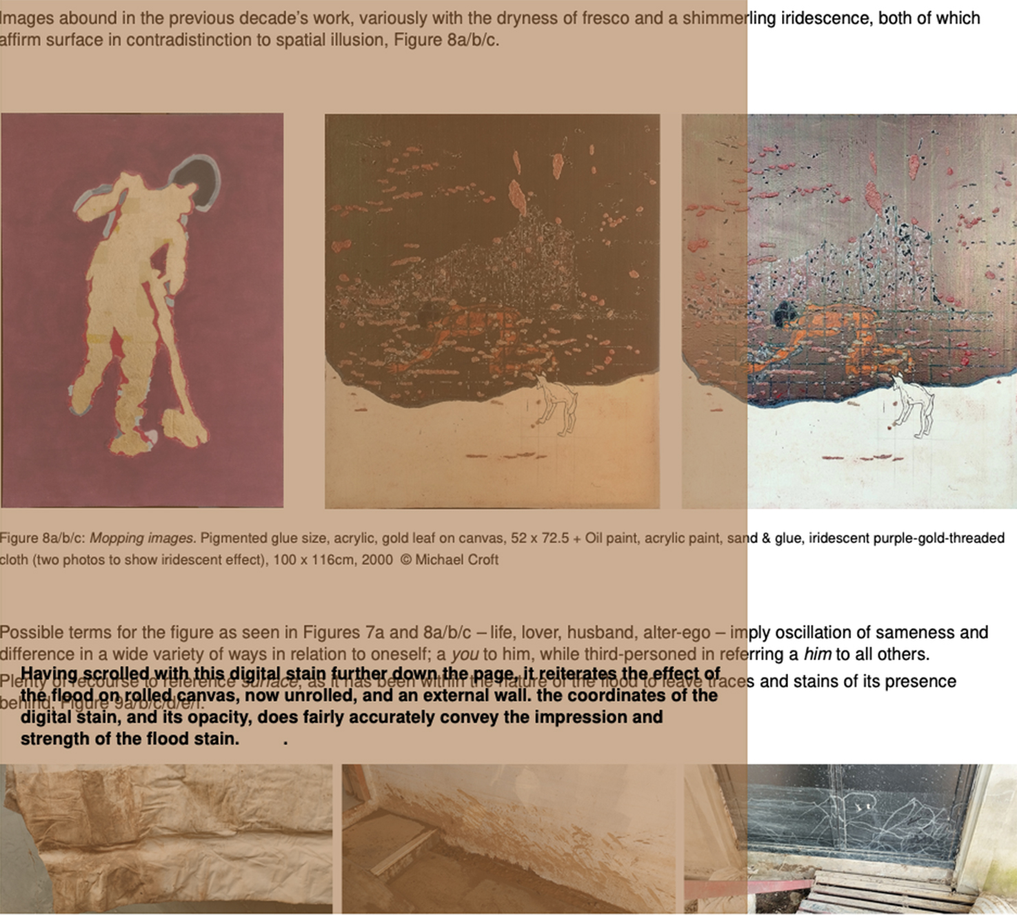 Having scrolled with this digital stain further down the page, it reiterates the effect of the flood on rolled canvas, now unrolled, and an external wall. the coordinates of the digital stain, and its opacity, does fairly accurately convey the impression and strength of the flood stain.