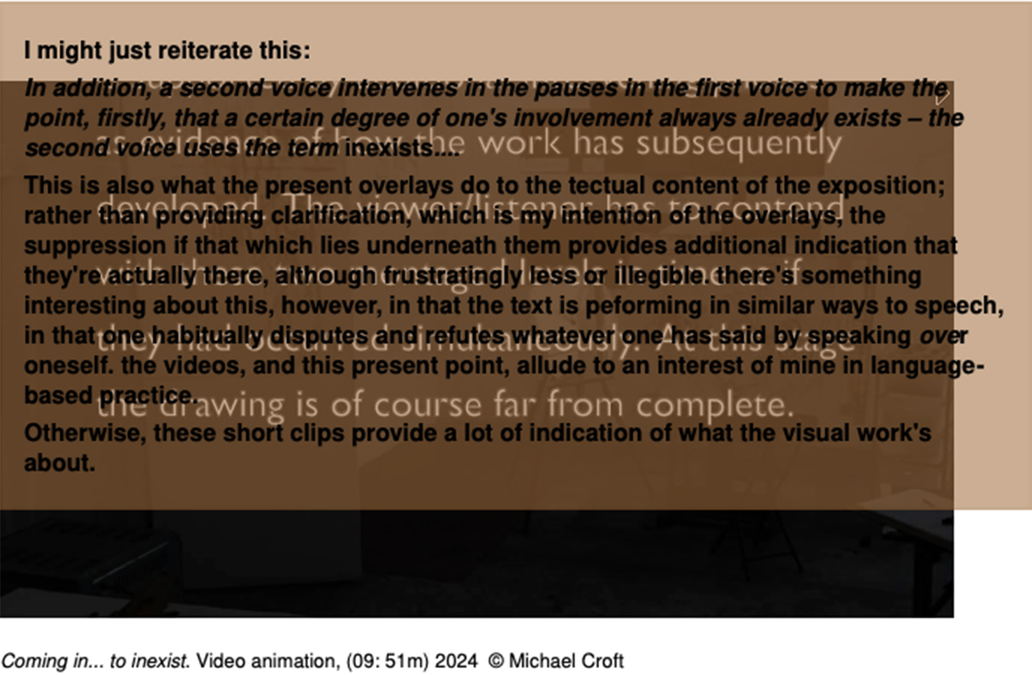 This part 2 of the video animation presupposes one’s having viewed the first part, the entire four parts of which comprise two superposed monologic and semi-read responses to a summary text entry to an artistic research exposition titled Flood's Tidal-turn on Relevance; 2024 - 2002.