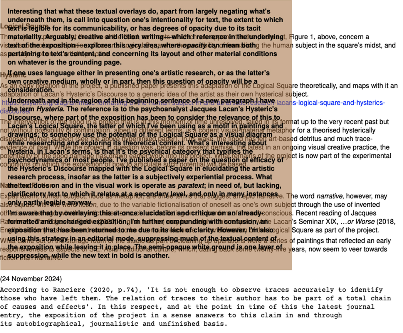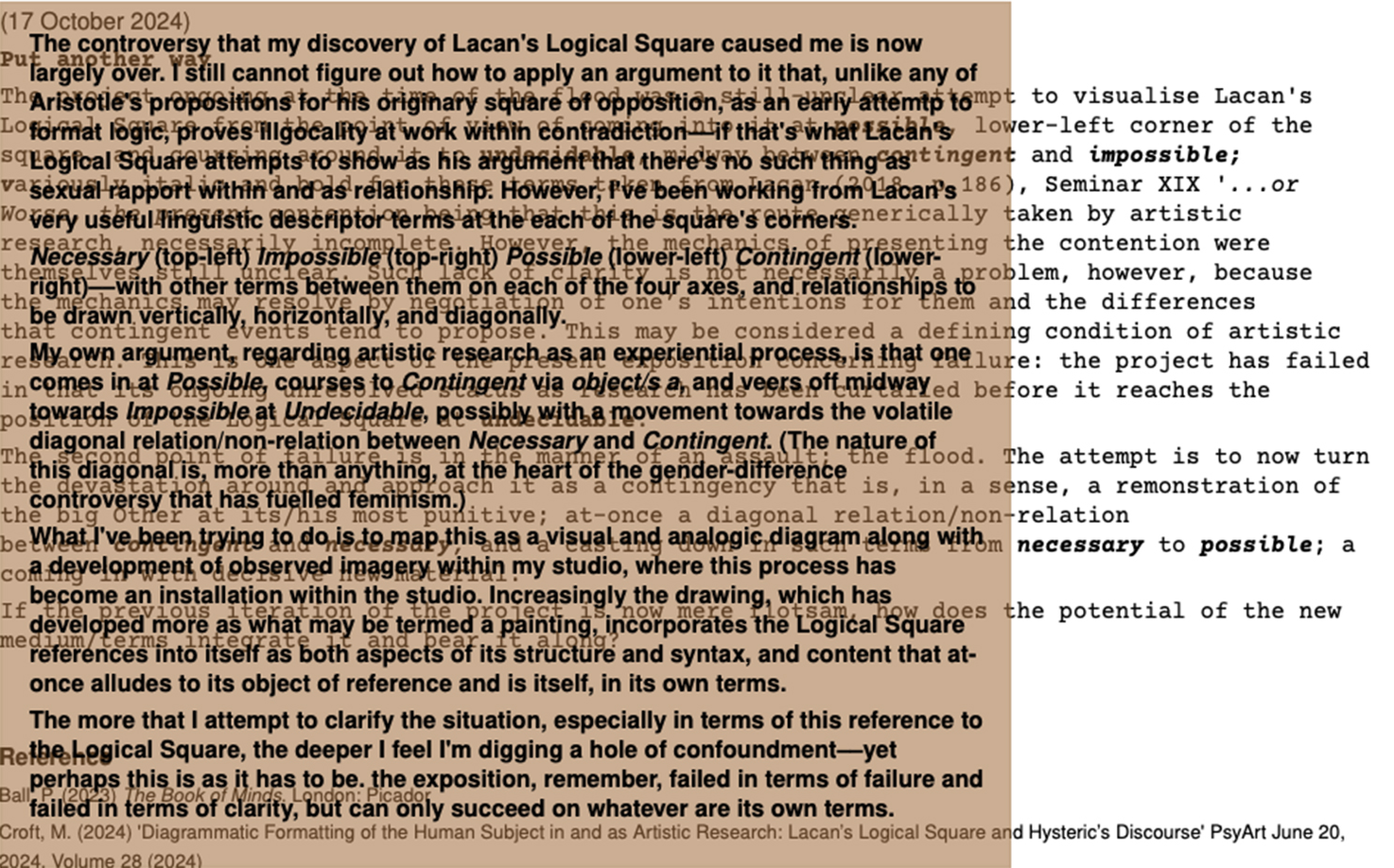 Underneath and in the region of this beginning sentence of a new paragraph I have the term Hysteria. The reference is to the psychoanalyst Jacques Lacan's Hysteric's Discourse, where part of the exposition has been to consider the relevance of this to Lacan's Logical Square, the latter of which I've been using as a motif in paintings and drawings; to somehow use the potential of the Logical Square as a visual diagram while researching and exploring its theoretical content. What's interesting about hysteria, in Lacan's terms, is that it's the psychical category that typifies the psychodynamics of most people. I've published a paper on the question of efficacy of the Hysteric's Discourse mapped with the Logical Square in elucidating the artistic research process, insofar as the latter is a subjectively experiential process. What the text does on and in the visual work is operate as paratext; in need of, but lacking, clarificatory text to which it relates at a secondary level, and only in many instances only partly legible anyway.