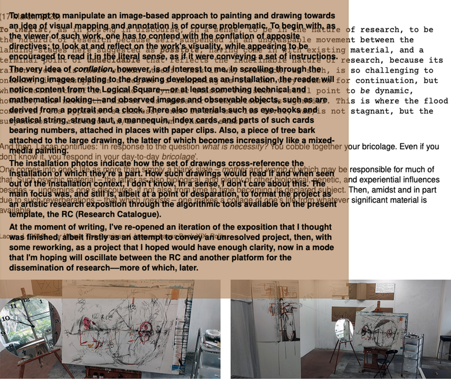The very idea of conflation, however, is of interest to me. In scrolling through the following images relating to the drawing developed as an installation, the reader will notice content from the Logical Square––or at least something technical and mathematical looking––and observed images and observable objects, such as are derived from a portrait and a clock. There also materials such as eye-hooks and elastical string, strung taut, a mannequin, index cards, and parts of such cards bearing numbers, attached in places with paper clips. Also, a piece of tree bark attached to the large drawing, the latter of which becomes increasingly like a mixed-media painting.