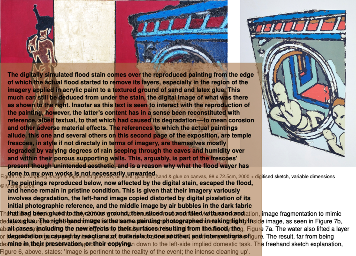 The digitally simulated flood stain comes over the reproduced painting from the edge of which the actual flood started to remove its layers, especially in the region of the imagery applied in acrylic paint to a textured ground of sand and latex glue. This much can still be deduced from under the stain, the digital image of what was there as shown to the right. Insofar as this text is seen to interact with the reproduction of the painting, however, the latter's content has in a sense been reconstituted with reference, albeit textual, to that which had caused its degradation––to mean corosion and other adverse material effects. The references to which the actual paintings allude, this one and several others on this second page of the exposition, are temple frescoes, in style if not directaly in terms of imagery, are themselves mostly degraded by varying degrees of rain seeping through the eaves and humidity over and within their porous supporting walls. This, arguably, is part of the frescoes' present though unintended aesthetic, and is a reason why what the flood wayer has done to my own works is not necessarily unwanted.