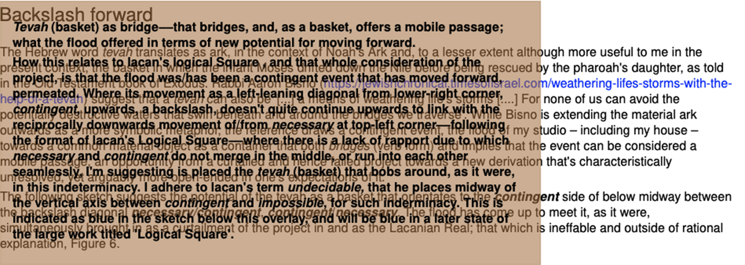 How this relates to lacan's logical Square , and that whole consideration of the project, is that the flood was/has been a contingent event that has moved forward, permeated. Where its movement as a left-leaning diagonal from lower-right corner, contingent, upwards, a backslash, doesn't quite continue upwards to link with the reciprocally downwards movement of/from necessary at top-left corner––following the format of lacan's Logical Square––where there is a lack of rapport due to which necessary and contingent do not merge in the middle, or run into each other seamlessly, I'm suggesting is placed the tevah (basket) that bobs around, as it were, in this indeterminacy. I adhere to Lacan's term undecidable, that he places midway of the vertical axis between contingent and impossible, for such inderminacy. This is indicated as blue in the sketch below this overlay, and will be blue in a later state of the large work titled 'Logical Square'.
