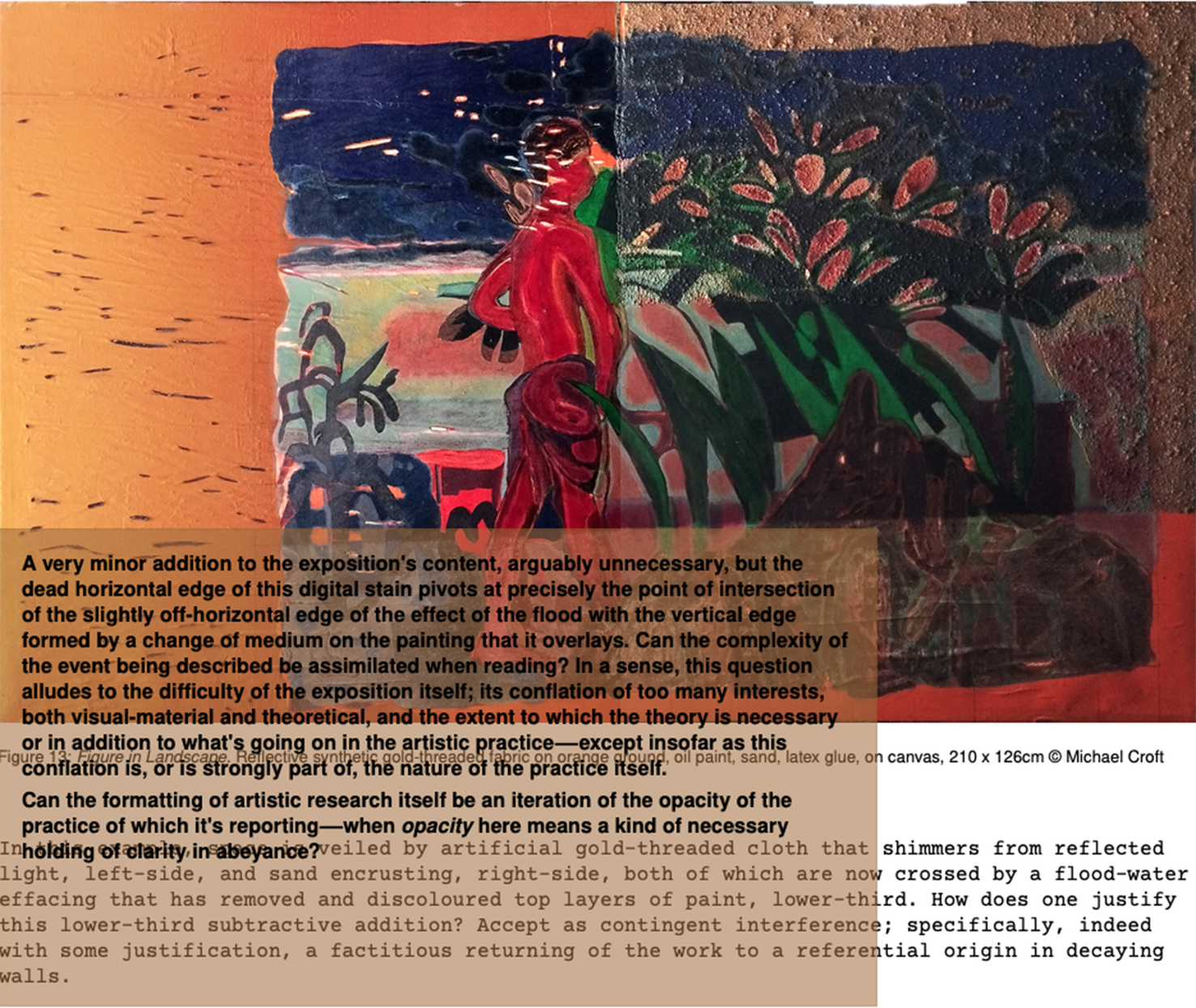 A very minor addition to the exposition's content, arguably unnecessary, but the dead horizontal edge of this digital stain pivots at precisely the point of intersection of the slightly off-horizontal edge of the effect of the flood with the vertical edge formed by a change of medium on the painting that it overlays. Can the complexity of the event being described be assimilated when reading? In a sense, this question alludes to the difficulty of the exposition itself; its conflation of too many interests, both visual-material and theoretical, and the extent to which the theory is necessary or in addition to what's going on in the artistic practice––except insofar as this conflation is, or is strongly part of, the nature of the practice itself.