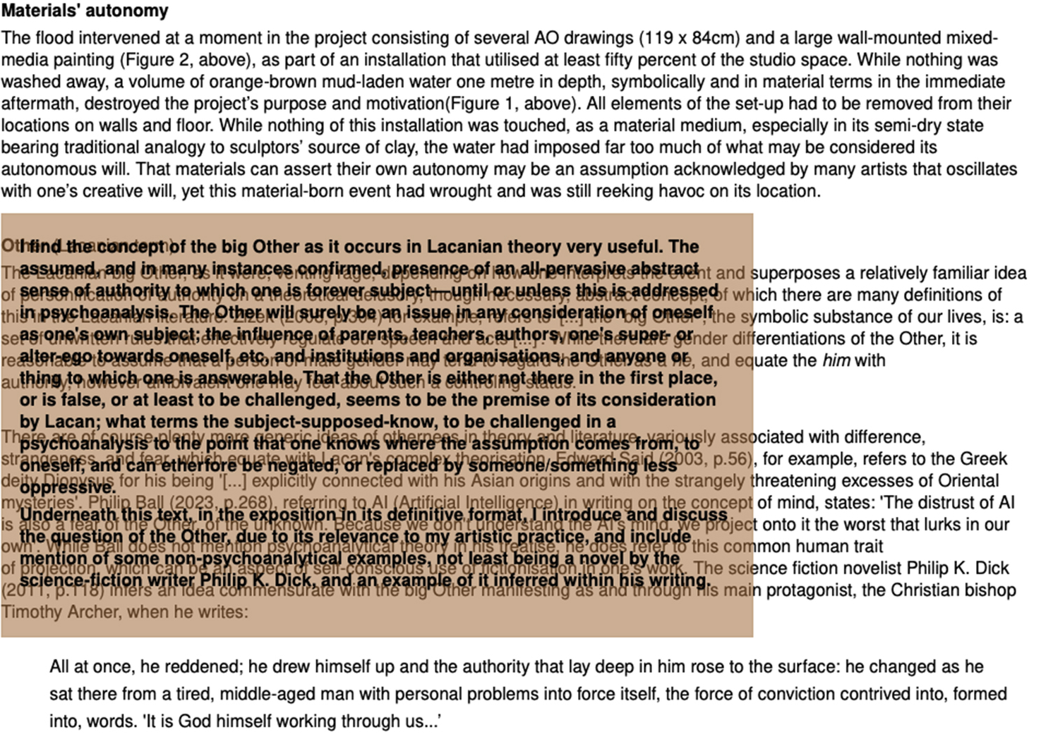 Thirteen screenshots from an iteration of a project titled 'After-the-Flood: an orange-brown stain', which before that was titled 'Flood’s Tidal-turn on Relevance; 2024 – 2002' with the subtitle, telling of the present iteration: An unresolved project, failed and reconsidered by the contingency of a flood. The project was at first submitted unsuccessfully to an artistic research call for proposals for failed or unresolved projects, and then, also unsuccessfully, to a journal that is more likely to have considered the project on the basis of clarity of relationship between practice and theory. The project in its present state, which can be accessed below as a PDF, variously succeeds or fails according to how the viewer/reader can negotiate a narrative that has developed in terms of ratios of evidence of visual practice and a location affected by a natural flood, theoretical reading associated with a project in progress at the time but curtailed by the flood, subsequent reading in relation to responsiveness to this new contingent situation, and more informally written journal entries. The thirteen screenshots are of new textual interventions on semi-transparent orange-brown screens laid over preexisting text and imagery in parts of the project where some simple non-theoretical explanation seems opportune. Such explanation is at-once elucidating and conflationary, depending on the extent to which one approaches the so-temed cameos as reader or viewer. Ideally, both approaches may be held in equilibrium, where their visuality is a form of comment on the manner of their legibility. It may not be difficult to imagine the screens as digital simulation of the effect of the flood water on physical works and, in some instances, works that have text as part of their visuality. At a point of exhaustion––a project that has, as it were, successfully failed––the cameos now at least foreground the language-basis of the project that oscillates with its visuality.