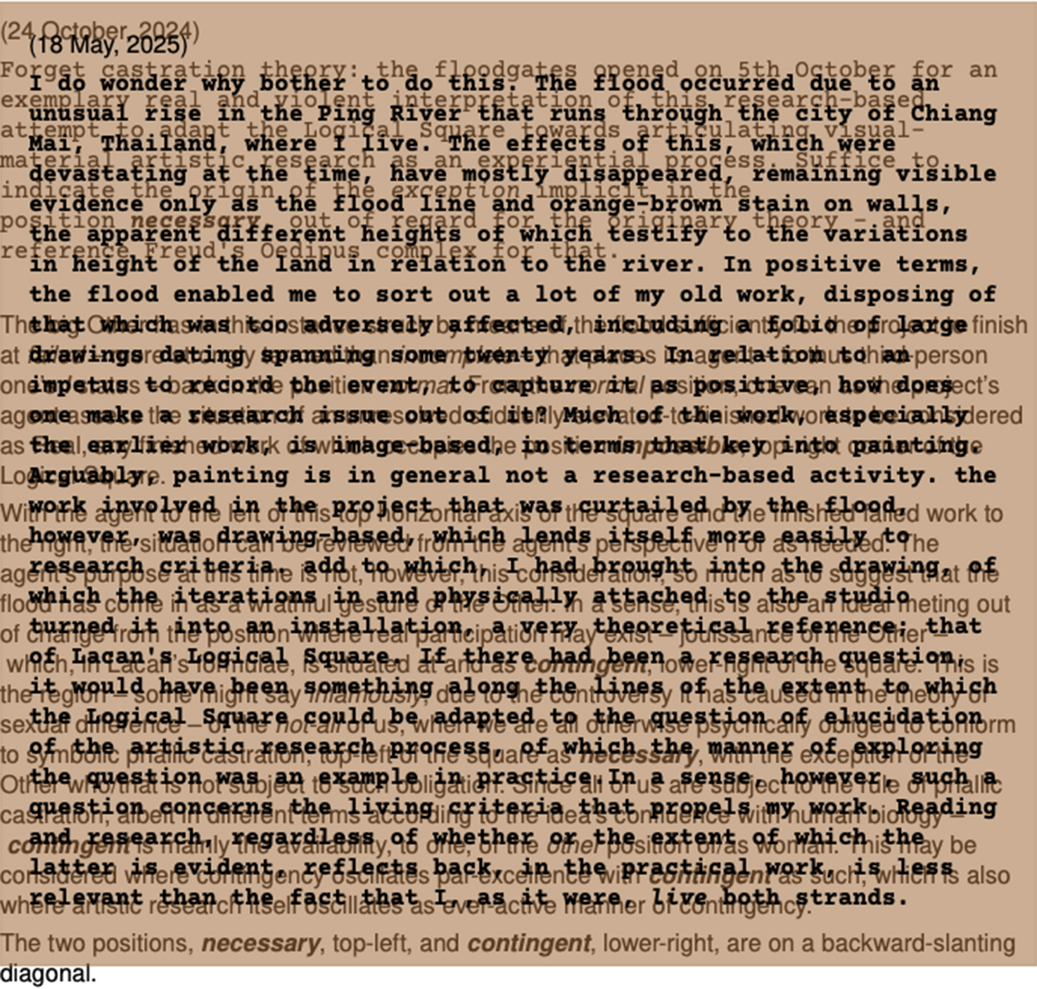 I do wonder why bother to do this. The flood occurred due to an unusual rise in the Ping River that runs through the city of Chiang Mai, Thailand, where I live. The effects of this, which were devastating at the time, have mostly disappeared, the remaining visible evidence only as the floodline and orange-brown stain on walls, the apparent different heights of which testify to the variations in height of the land in relation to the river. In positive terms, the flood enabled me to sort out a lot of my old work, disposing of that which was too adversely affected, including a folio of large drawings dating spanning some twenty years. In relation to an impetus to record the event, to capture it as positive, how does one make a research issue out of it? Much of the work, especially the earlier work, is image-based, in terms that key into painting. Arguably, painting is in general not a research-based activity. the work involved in the project that was curtailed by the flood, however, was drawing-based, which lends itself more easily to research criteria. add to which, I had brought into the drawing, of which the iterations in and physically attached to the studio turned it into an installation, a very theoretical reference; that of Lacan's Logical Square. If there had been a research question, it would have been something along the lines of the extent to which the Logical Square could be adapted to the question of elucidation of the artistic research process, of which the manner of exploring the question was an example in practice.In a sense, however, such a question concerns the living criteria that propels my work. Reading and research, regardless of whether or the extent of which the latter is evident, reflects back, in the practical work, is less relevant than the fact that I,as it were, live both strands.