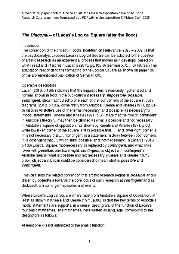 The project comprises text, location photos, photos of artworks, and video animations that record the experiences of a natural flood that affected house and studio. The project’s content is a consideration of the consequences of the flood towards an existing project in progress at the time and on existing finished artwork. The finished exposition had two unsuccessful reviews; the first due to insufficiently proposing a workable consideration of failure, the second for insufficient clarity of purpose. As this self-published iteration, screenshots taken from the original iteration as formatted on the RC are overlaid with short summaries of aspects of the project’s content, in terms pertaining to both the staining of the flood water and the often unacknowledged writing, re-writing, and over-writing of whatever is the language basis of one's practice. The screenshots, as simulated text-and-image cameos, have the summaries ranged next to them as legible text. The original submitted project is archived though accessible as a PDF only, along with its supplementary papers and video clips.