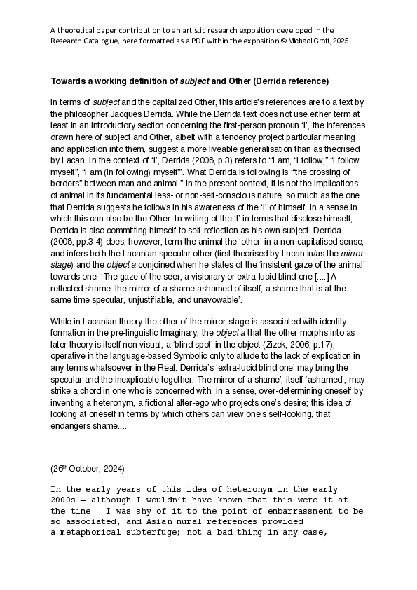 The project comprises text, location photos, photos of artworks, and video animations that record the experiences of a natural flood that affected house and studio. The project’s content is a consideration of the consequences of the flood towards an existing project in progress at the time and on existing finished artwork. The finished exposition had two unsuccessful reviews; the first due to insufficiently proposing a workable consideration of failure, the second for insufficient clarity of purpose. As this self-published iteration, screenshots taken from the original iteration as formatted on the RC are overlaid with short summaries of aspects of the project’s content, in terms pertaining to both the staining of the flood water and the often unacknowledged writing, re-writing, and over-writing of whatever is the language basis of one's practice. The screenshots, as simulated text-and-image cameos, have the summaries ranged next to them as legible text. The original submitted project is archived though accessible as a PDF only, along with its supplementary papers and video clips.