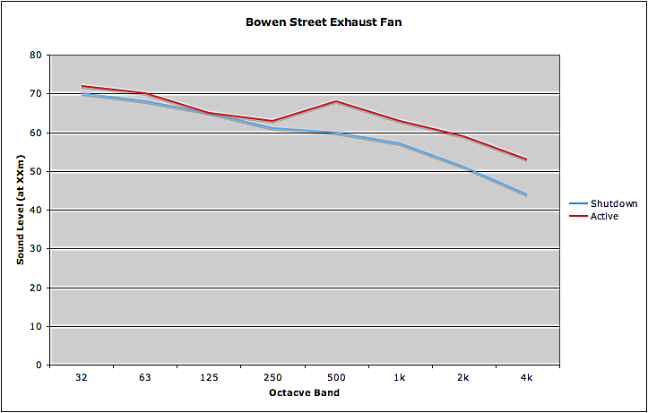 The spectogram provided an imaginative stimulus – the shutdown being equivalent with the removal of a “dominating voice” – but it also helped to demonstrate the actual, perceivable, implication of specific CRESSON sound effects. The analysis emphasized the drone, mask, and filtration sound effects (see above), which assisted students in identifying analytical approaches to their interventions. The drone was identifiable in the horizontal broadband pattern in the lower section to the left of the image; masking was depicted in terms of the fog analogy; and, on-site, it was clear the metal awning was adding a filtration effect to the sound volume. The filtration effect was further emphasized with 1/3 band octave sound level measurements at the site both before and after the shutdown. After the shutdown, a significant decrease in the volume of frequencies above 200Hz could be identified (see figure 3). It is interesting to note that the most sensitive range of human hearing (approximately 1-4kHz) was positively impacted by the shutdown, creating acoustic conditions that enabled clearer communication. It is tempting to connect this beneficial change to the listening environment with the almost instant emergence of human voices (represented by the dark vertical lines to the right of Figure 2), though of course a more detailed study would be required to make such an assertion.