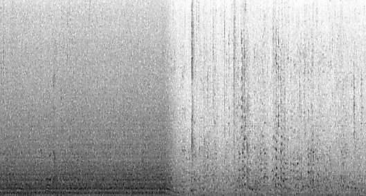 Figure 2: Spectogram of Exhaust Outlet Shutdown (generated with Audiosculpt[3]). In this rescaled version of the original spectrogram, the y-axis is approximately 4kHz and the x-axis is approximately 30s. The darkest broadband frequencies at the bottom of the image range from 150-500Hz. The vertical lines represent human voice formants.