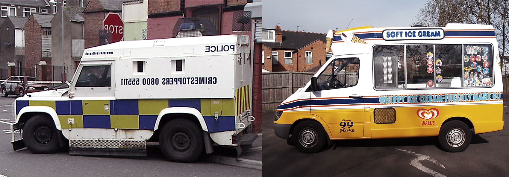 In addition, perhaps it is not a coincidence that police vans were redesigned to a particularly ice cream truck-like construction in 2001, right after the NI police force transitioned from the Royal Ulster Constabulary to the Police Service of Northern Ireland as a result of the Good Friday Agreement in 1998.