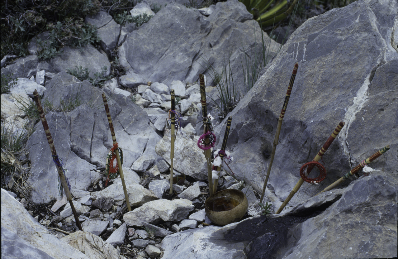 LK: Nuoli on terävä ase. Sillä voi metsästää, taistella ja puolustautua. Kun wirrarika tuo nuolen pyhälle paikalle, hän usein pyytää jotain yhteisölleen, perheelleen tai itselleen. Ne ihmiset ja ei-inhimilliset toimijat, jotka osallistuvat pyyntöön, ovat yleensä jollain tavalla merkittynä nuoleen. Tässä nuolessa kangastilkkuihin ristipistoin kirjaillut ihmiset merkitsevät tyttäriä ja pienet punotut verkot poikia. Eduardo osaa lukea nuolen tarinaa. Näkemisen kyvyn saavuttaneet wirrarikat saattavat katsoa nuolia ja muita uhriesineitä hiukan eri tavoin kuin muut.
