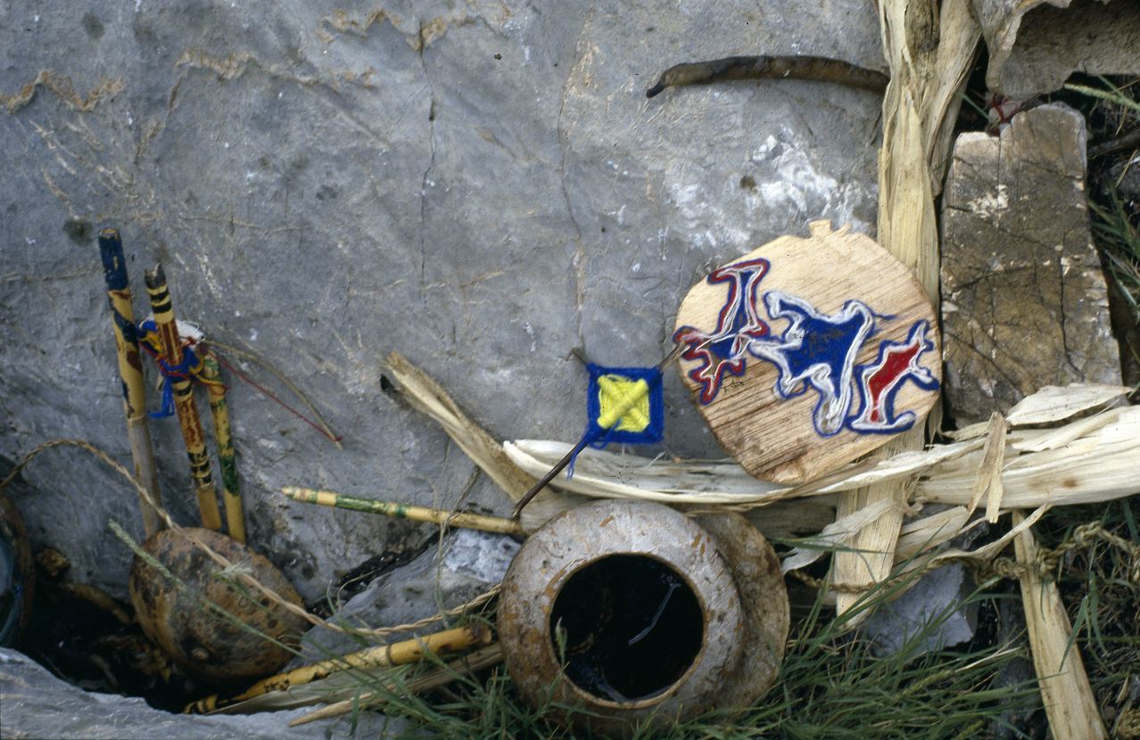 Puulevystä, mehiläsvahasta ja langoista valmistettu nierika on jätetty muiden uhriesineiden kanssa pyhälle paikalle Wirikutaan.