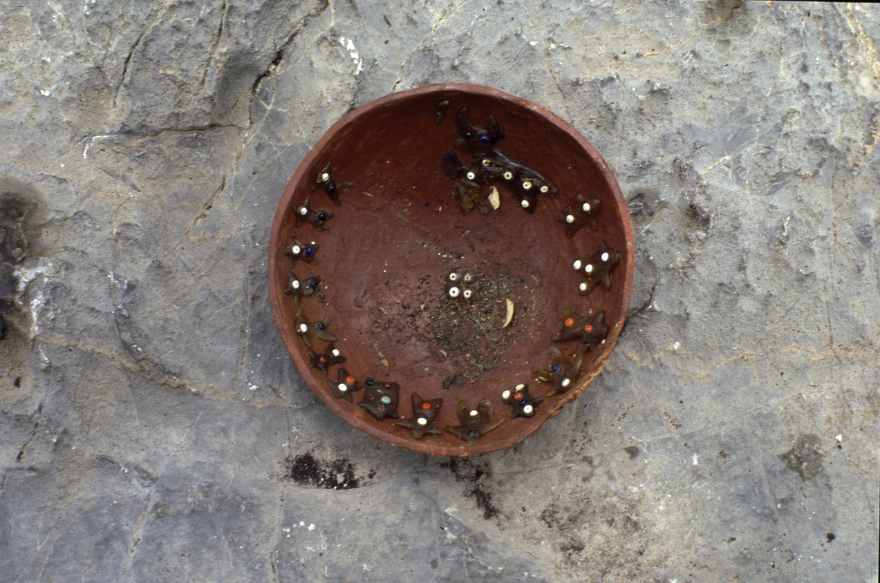 Xukuri on värjätty punaruskealla maavärillä ja sen sisäpintaan on muovailtu mehiläsvahasta ihmishahmoja ja härkä.