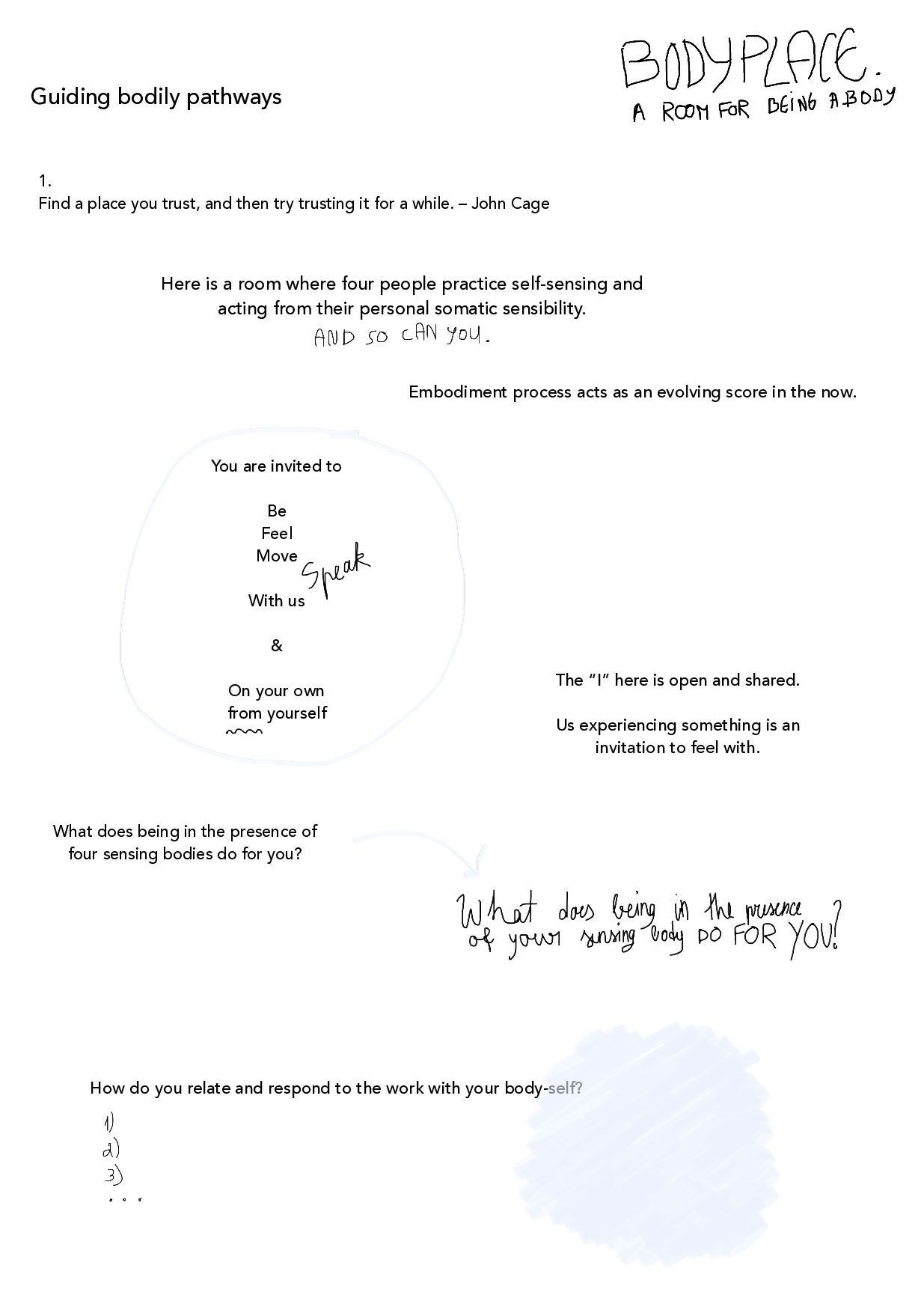 We offer you a papersheet with guiding bodily pathways upon entrance. The papers are at the door. We hope this makes your landing easier, but there is also a chance you passed it by.
