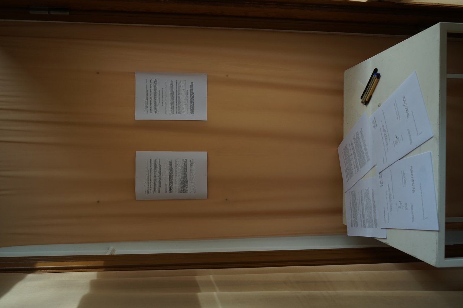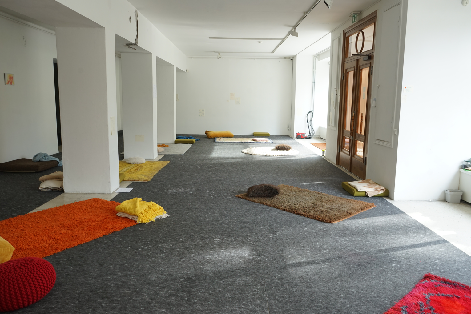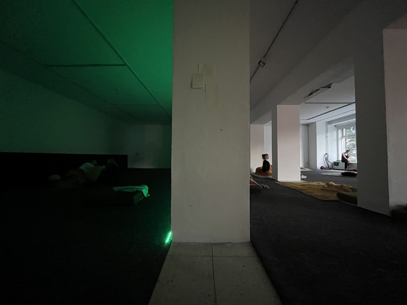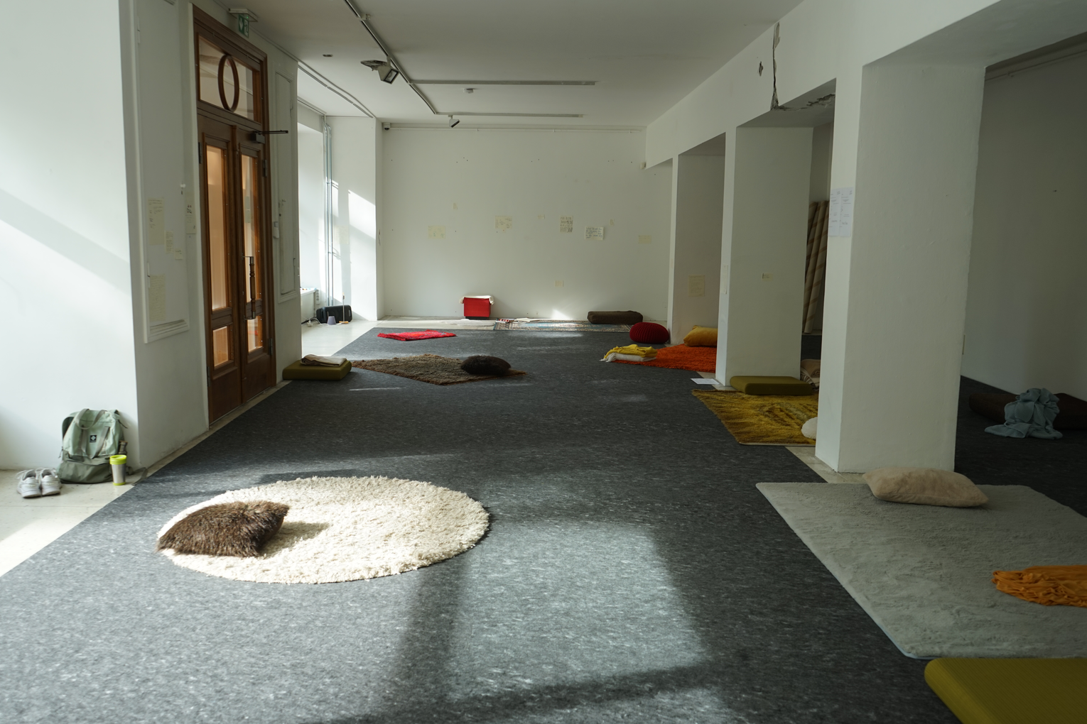 The practice evokes a "turning around" of perspectives, as worded by Annika, a visitor, whereby the person undergoes an internal (and spatial) turn in which they go from looking at the practice from the outside to turning their attention towards their inner space and therefore looking outwards from themself. This turning faciliatets witnessing the practice as performance unravelling within, which means the visiting body themself becomes a place of performance. Looking at the practice is possible in as much as one takes part in it.