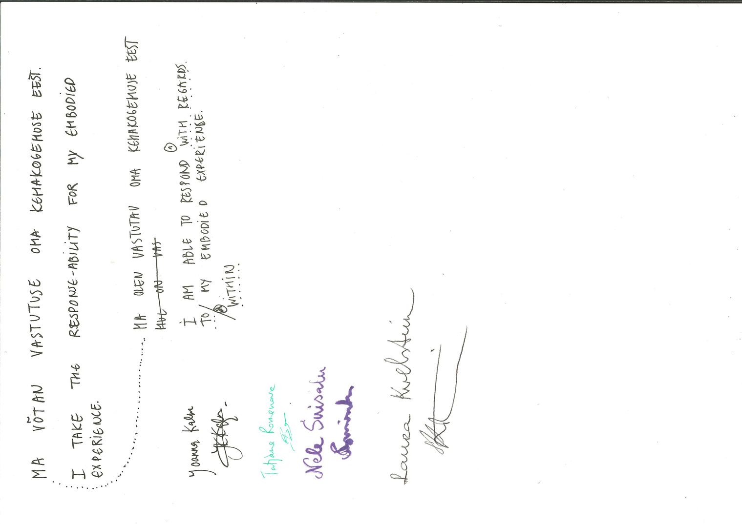 In many ways, I was in a praradoxical situation: wanting to witness differential becomings, but not able to say how it could be attained or direct it very overtly. Because to do that, would have meant to define the practice and the findings, but I wanted us to figure out a collaborative and intra-active becoming of both – the practice framework and our embodiments. Not to allocate most of the power to the side of practice to form certain kinds of bodies, but to allow embodiment processes likewise to shape the practice. Ultimately, I was aiming for having both sides – embodiment and practice – responsive.