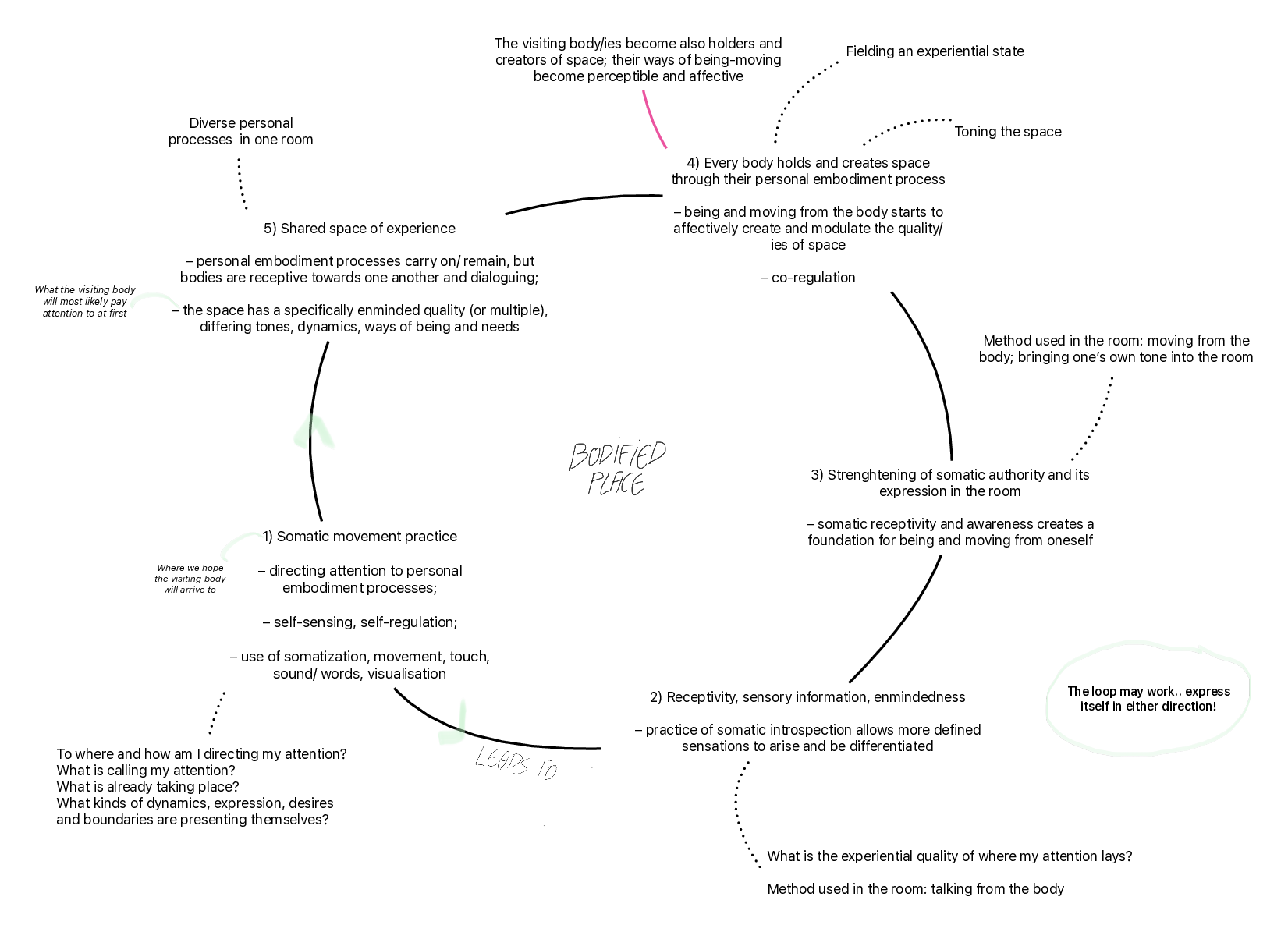 The underlying method for the practice/room is to follow one's own embodiment process as an evolving score in the now, thereby highlighting how felt needs, desires and boundaries are in a constant shift anf inform our actions. Furthermore, the dynamics of each person – both the working group members' and visiting bodies' – becomes the basis for content emergence and dramaturgy (spacetimemattering) in the moment. Additionally, the performers and the visiting bodies are encouraged to inquire into the dynamics of their living matter and be-move-engage in as much harmony with their personal processes as possible. In short, we practice being somatically agentic. The ongoing research inquiry looks into how participants' expression – experience in time, intensity, scale, movement modality – and engagement – inwards... outwards attention and action – can start to re-form differently when parts of somatic self are fully included and expressed.