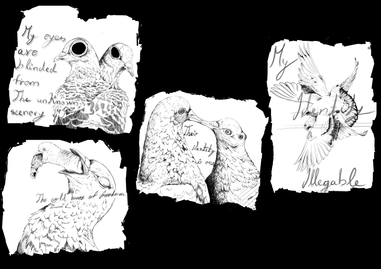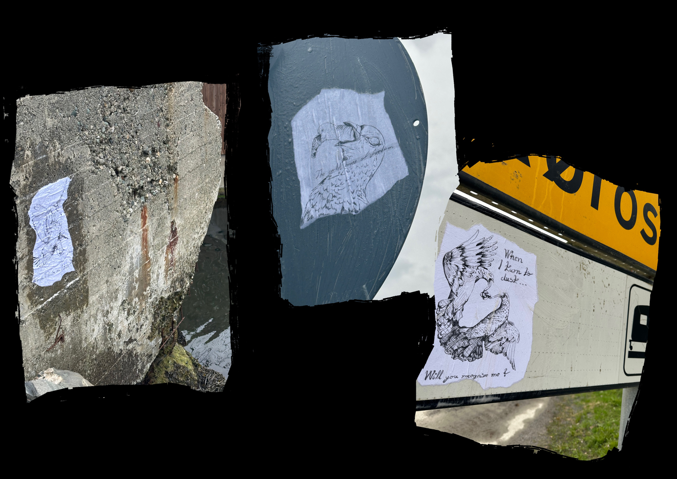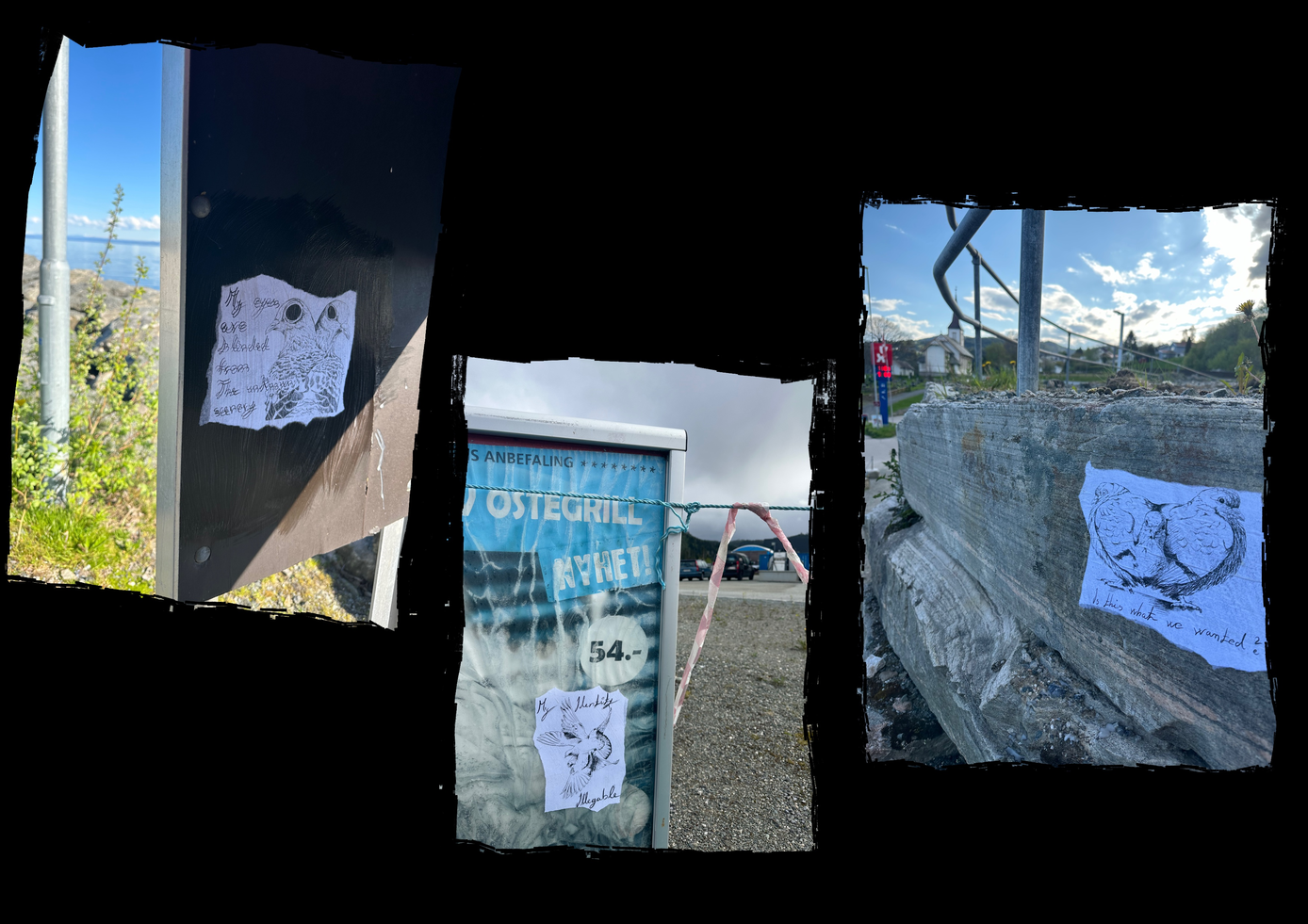 Previus semester I decided that I want to expand my pigeon sketches to streets. First I started to write poems which worked as a coping mecahnism for my own personal challenges and still adapting to a new environment. Later I morphed these poems into one long poem that I decided to break it into individual verses, where each became a foundation for a separate illustration (poster), that I would place in different towns and villages around Trøndelag. Turning my private reflection into public expression.