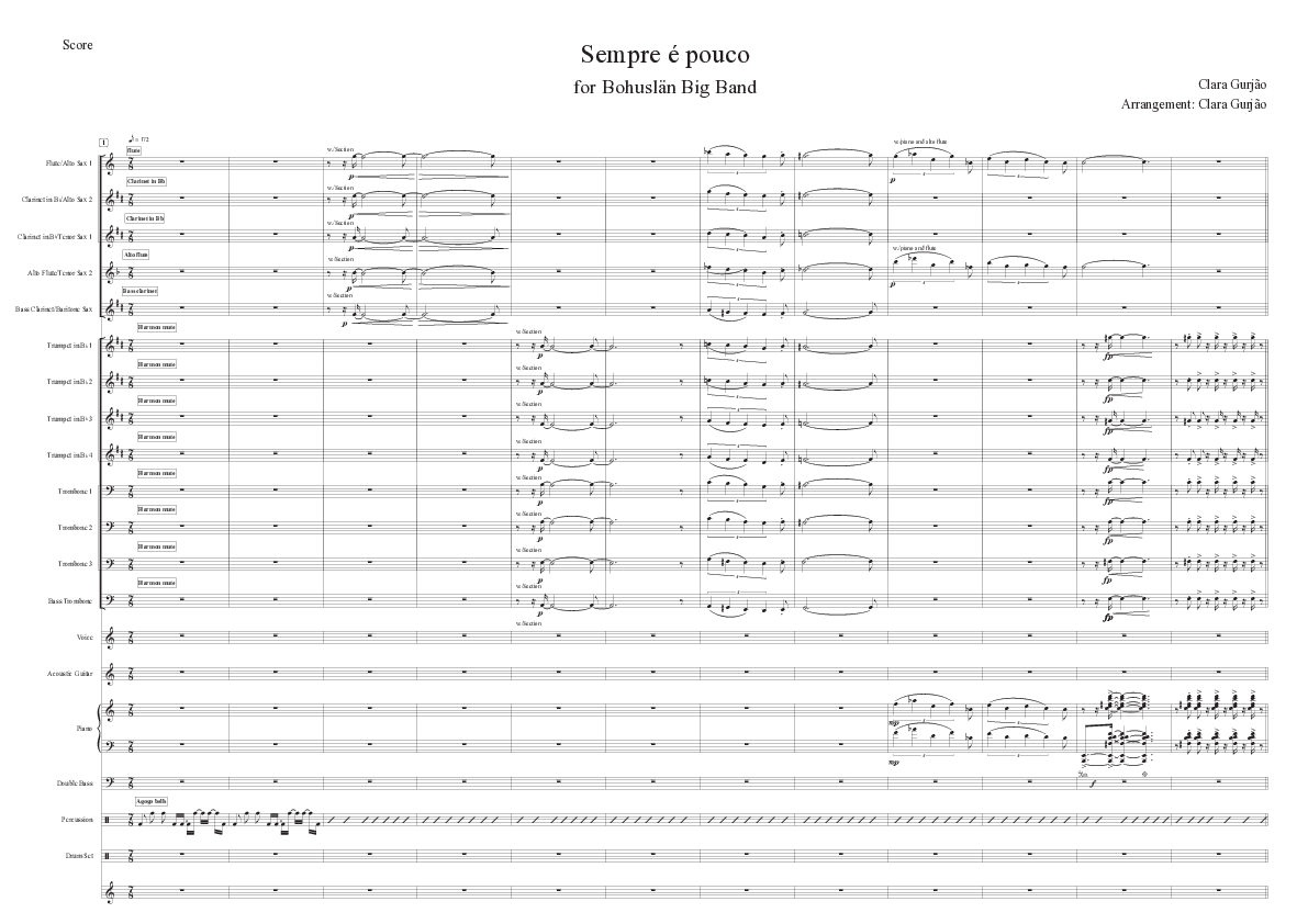 This conversation made me pause to reflect on how often we are unaware of the extent to which our musical identity is expressed in the way we compose and play. Moreover, what we believe we are communicating through our music is not always what the listeners will actually perceive. The final musical result of my arrangement with the performance of the musicians from Bohuslän Big Band was amazing to me, especially because it sounded different (and much more interesting) than I thought it would sound at the beginning of the process. The samba character was highlighted and I could perceive a whole new set of layers in my own song. I was also able to preserve the original character of the guitar, thanks to a good amplification system and by highlighting it in key sections of the arrangement - such as measures 12–15 and again in the final measure (152). Below you can find the score and the video of the performance: