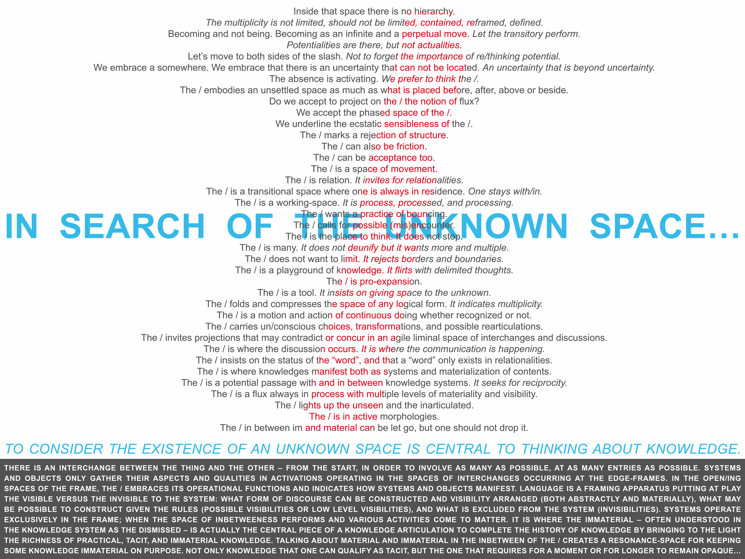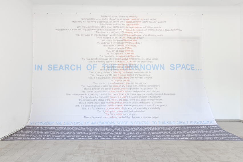 The “/” embodies a space as much as what is placed before, after, above or beside it. The "/" is a carrier of possibilities that invites projections that may contradict or concur in an agile liminal space of interchanges and discussions. The "/" is a space of movement. It carries un/conscious choices, transformations, and possible rearticulations. The "/" is where knowledge manifests both as system and materialization of contents.