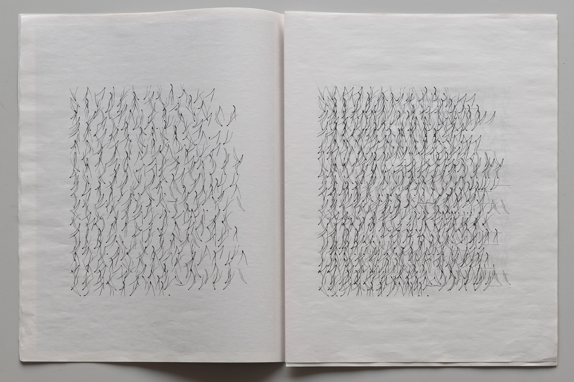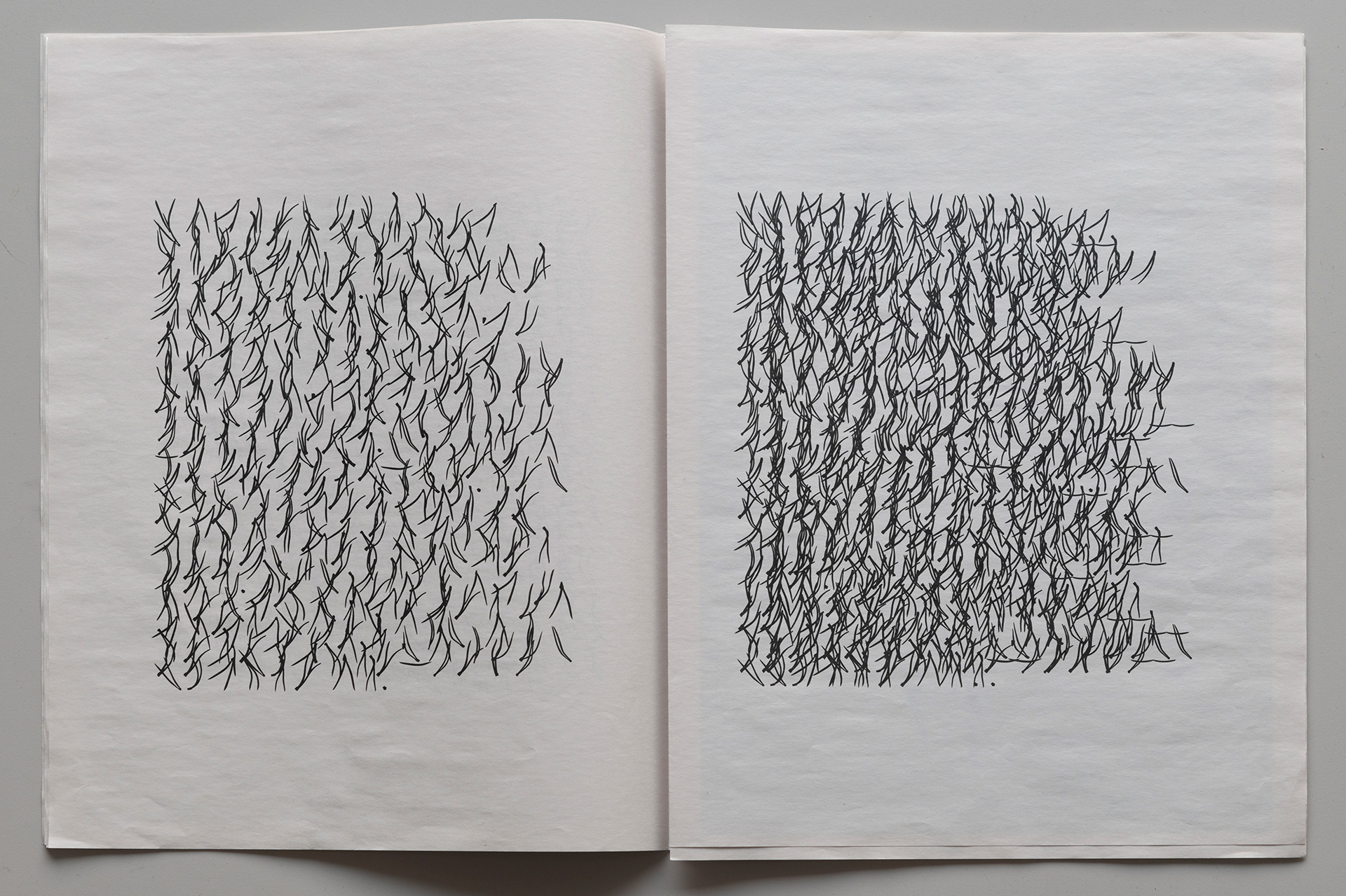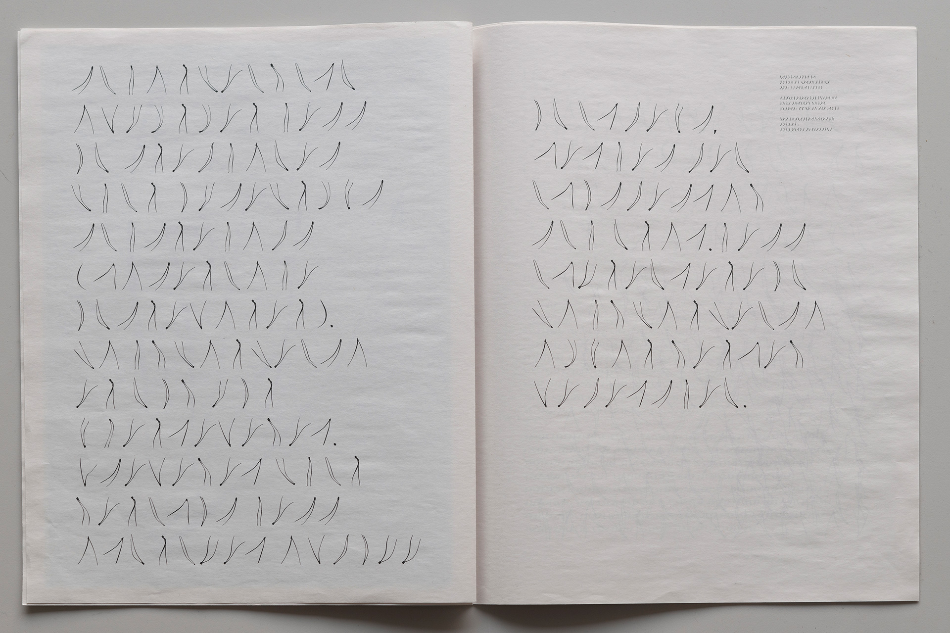 In this landscape, connections can arise to what is described as asemic writing – a writing without fixed semantic content. It can be understood as text not meant to be read in the usual sense, but rather sensed and interpreted visually. Asemic writing is about evoking a reaction.
