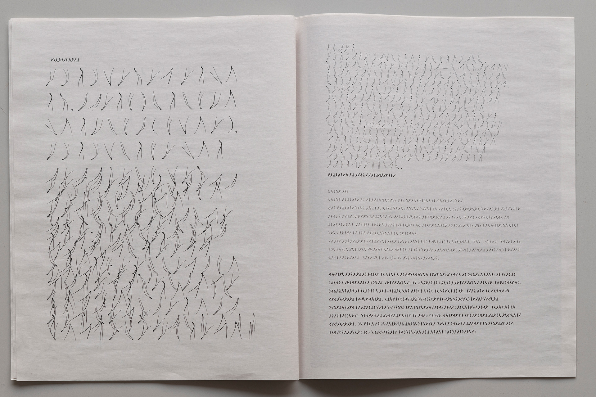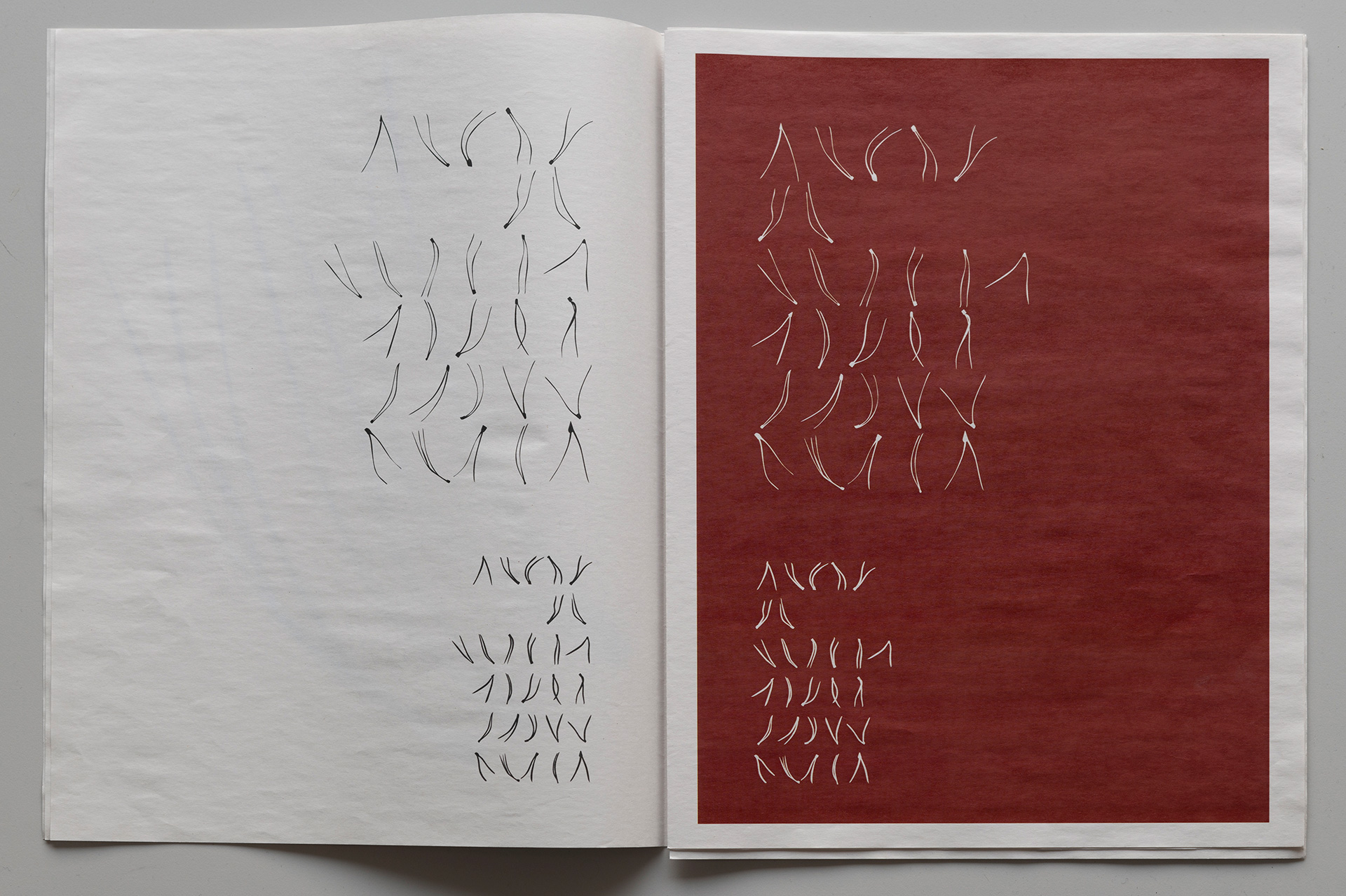 Each character in Pine carries a potential for meaning, but it’s only when these forms are combined into a system that they open up the possibility for a kind of visual communication. Even if a single sign doesn’t communicate clearly on its own, the combination of forms can suggest something – an abstract, yet expressive language. A language with structure and pattern might be read as a method of listening and responding – a language without grammar, but with form and rhythm that can generate a kind of resonance. This, of course, raises questions about the limits of recognition and resonance in this kind of visual communication: How long are we willing to stay with something we don’t fully understand – something we can’t quite grasp, but that still stirs a sense of echo or familiarity? What allows us to remain there?