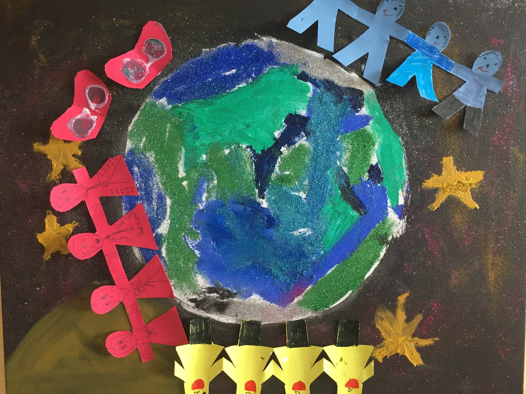 Through thinking about diffraction as the differences and relationships between faiths created in the act of making interfaith art, the meanings and values of faiths are expanded. An example given by Barad that explains the generative power of diffraction is water waves, or ripples, overlapping.[48] Points of intersection between two different ripples offer a way of understanding the significance of an artwork about faith made by children of different beliefs. The materiality of an artwork in which children of different faiths explore what faith means to them, like the intersection of two ripples meeting, makes intra-faith: two faiths coming together to make new beliefs. Such co-constitution of belief is critical in contemporary times in which religion is used repeatedly as a reason to ‘other’ certain demographics. Intra-faith relationships hold the possibility for building communities of understanding that hold the key to bridging what is often constructed as one of the greatest divides in contemporary times. A residue from the diffractive experiments I am explaining is presented below. This image of the ‘world’ was co-created on the first day of an arts practice workshop by children participating in the project in London. The artwork creates community and fictively speculates a future of community being united in global togetherness. Here, religion and belief unite bodies rather than separate them.