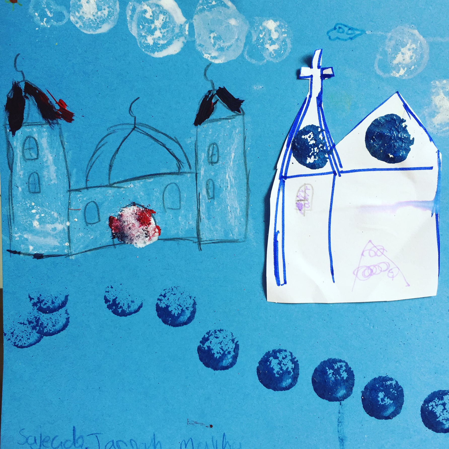 The rationale for this timing is as follows. The work with children facilitates a process of community engagement. As parents see my continued involvement in their children’s education through the arts workshops, which are often run as school holiday programs, the parents begin to develop a relationship with me as an artist researcher. Focus groups with parents are held after an intensive period of working with children. For example, after a week-long school holiday program or a consolidated period of my time making art in a school, mosque or church. Focus groups explore belonging, identity, community and religion. Follow up interviews with parents and family members facilitate greater detail in discussions on these themes. The rich visual, embodied and qualitative data gathered through these methods sits alongside quantitative data generated through survey responses measuring broader community perceptions of belonging, intercultural understanding, religious belief and acceptance of difference. Surveys are distributed in the communities in which the workshops and focus groups take place. Pop up galleries of the children’s art works are installed in shopping malls, libraries and community hubs and surveys are distributed at these pop-up galleries to those who pass by, or show interest in, the exhibitions. For the purposes of this paper I am only discussing stage one of the methods, the arts workshops with children. All three stages of the project run in Sydney, Melbourne, London and Manchester. For the purposes of this paper I focus on data from the UK, as this data has an explicit cultural and textual relationship to the discussions of the Prevent agenda I undertake below. For discussions of the Australian fieldwork see Hickey-Moody[5]. The UK context provides a particularly useful point of comparison for Australian cities because of the history of cultural and political work undertaken through Prevent and the existing multi-faith communities in Manchester and London. Much British sociological research usefully maps ‘liminal forms of ethnicity’[6] developed as a means of negotiating inter-faith prejudice in urban, multicultural contexts.