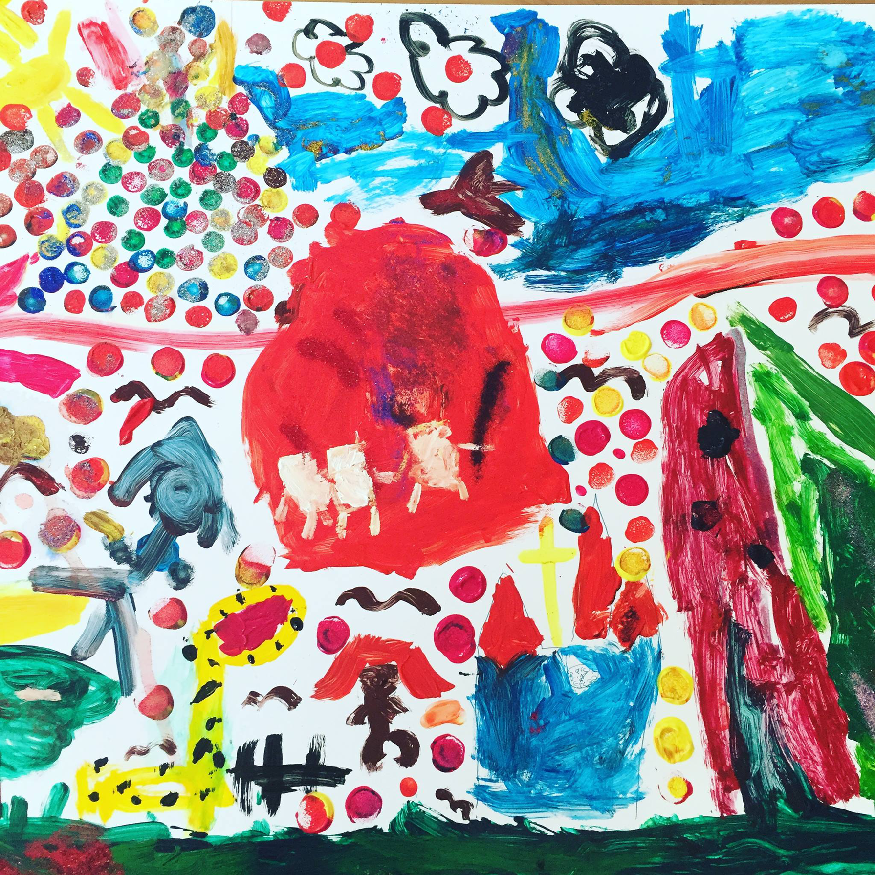 My arts methods workshops for children include participants aged 3 and up, however the data analysed in this paper is from UK participants aged 6–10. These children explored the themes of ‘love,’ ‘friendship,’ ‘my future,’ and ‘different beliefs.’ They visually answered the question ‘What really maters’ in pairs and created group paintings of interfaith futures. The children were provided with mixed media materials including paints, wool, pencils, crayons, and felt, and were asked to create artworks within the themes discussed, as well as self-portraits and artworks representing different emotions (‘happy,’ ‘sad,’ ‘joy,’ and ‘angry’). The children initially worked on their own, before collaborating in groups to create images of ‘shared values’ and then a large ‘inter-faith future.’ They were also encouraged to explore other media types, such as video, Instagram, and Snapchat if they wished. Their art making was recorded on a digital video camera. The recordings show children’s relationships building through collaboration. The resulting artworks transmitted feelings non-verbally through colour, sound, texture, and moving image. The artworks are a part of a process of quantum thinking “that is inevitably situated and always already physically active.”[15] For example, the image below is a photograph of a large canvass painted by 6 children in South East London. It is a picture of the future and, more specifically it is a picture of what an interfaith future that embodies the values of the whole group will look like. The large red shape in the middle of the canvass is a mosque. There are three people holding hands in the mosque, illustrating the kinds of support that can be found in religious community. The lower left-hand side of the painting depicts a zoo (featuring a very lovely giraffe). The zoo demonstrates the children’s concerns about the environment, and has been included because the children thought zoos keep animals safe. The lower right-hand side of the image features a church and then a forest (the green in the far right). The top right-hand side features an airport with planes flying in to land, showing that “we understand differences from other countries,” as the children said. The sun shines a rainbow spectrum of colour over this world of acceptance and healthy ecosystems, it is a future in which I would be happy to live. The picture is a transmitter. It is both the result of a lot of discussion and it evoked much more discussion, even though its methods of communication are material and visual.