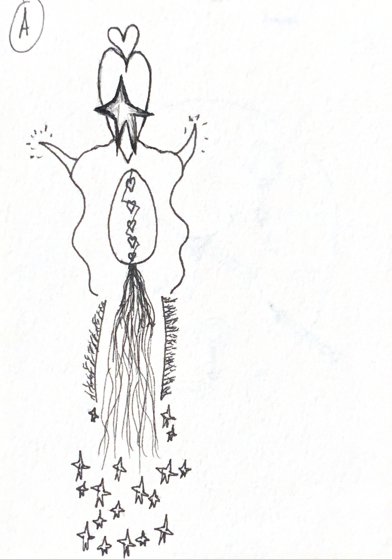 How can you otherwise explain the movements of our hips; when the frequency travels, starfished-shaped, hitting the linoleum floorings, RIcocheting back through our boddesses- the hips break all axis, the body extends itself through all dimensions. a limb breaks it’s self, falls over it’s own potential; desires genetic wilding; the limb cracks. a vessel opens: from the cracked +**** a purple-tinted tentacle creates itself, lizard skin around it a scar is left with diamonds., my collapsed leg morphes into a mermaid tale. my **** is ovulating. like fish- my belly holds eggs.