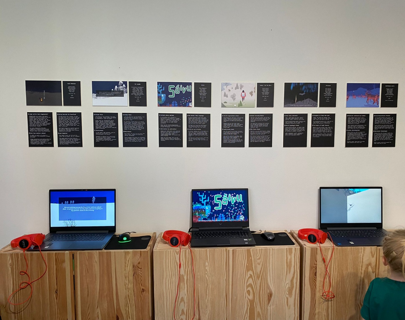 The exhibition featured five playable games (figure 2.), including professional industry pieces like Skábma – Snowfall by Red Stage Entertainment (2022) and Raanaa – The Shaman Girl by Miksapix Interactive (2019). Additionally, it included a ten-minute video reel with snippets of all documented games and their designers from the past ten years, pictures, designer comments, and design inspiration themes from the Saami Game Jam event (Saami Game Jam 2025). The exhibition material was multilingual, primarily in English and North Saami, with some content in Skolt Saami and Inari Saami for those brave enough to play the games.