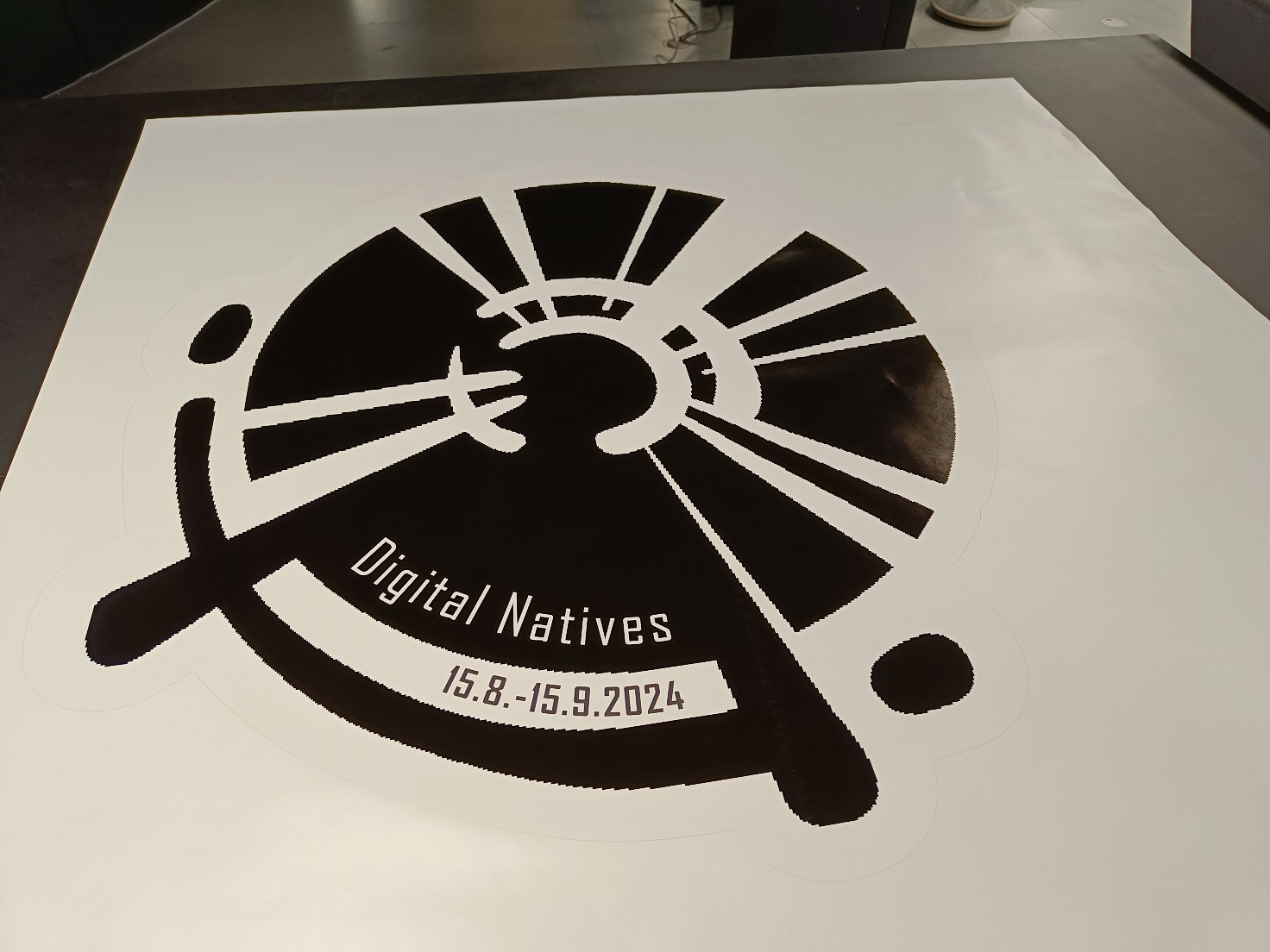 For this exhibition, we set out to create a window sticker featuring the Reahpenráigi-logo, designed by Sofi Kurtti for the first Saami Game Jam. The logo perfectly encapsulated the themes we wanted to emphasize: Saami cultural-centered design, equality in creation, and more. Working with a limited budget once again, we turned to libraries for support. This time, we used the DIY tools at Oodi, Helsinki's central library, specifically its urban workshop's large-format printer, capable of producing stickers up to 130 cm wide. With a library card, we booked a time slot for the printer, which is highly popular for printing large posters. This gave us a single opportunity to print the sticker.