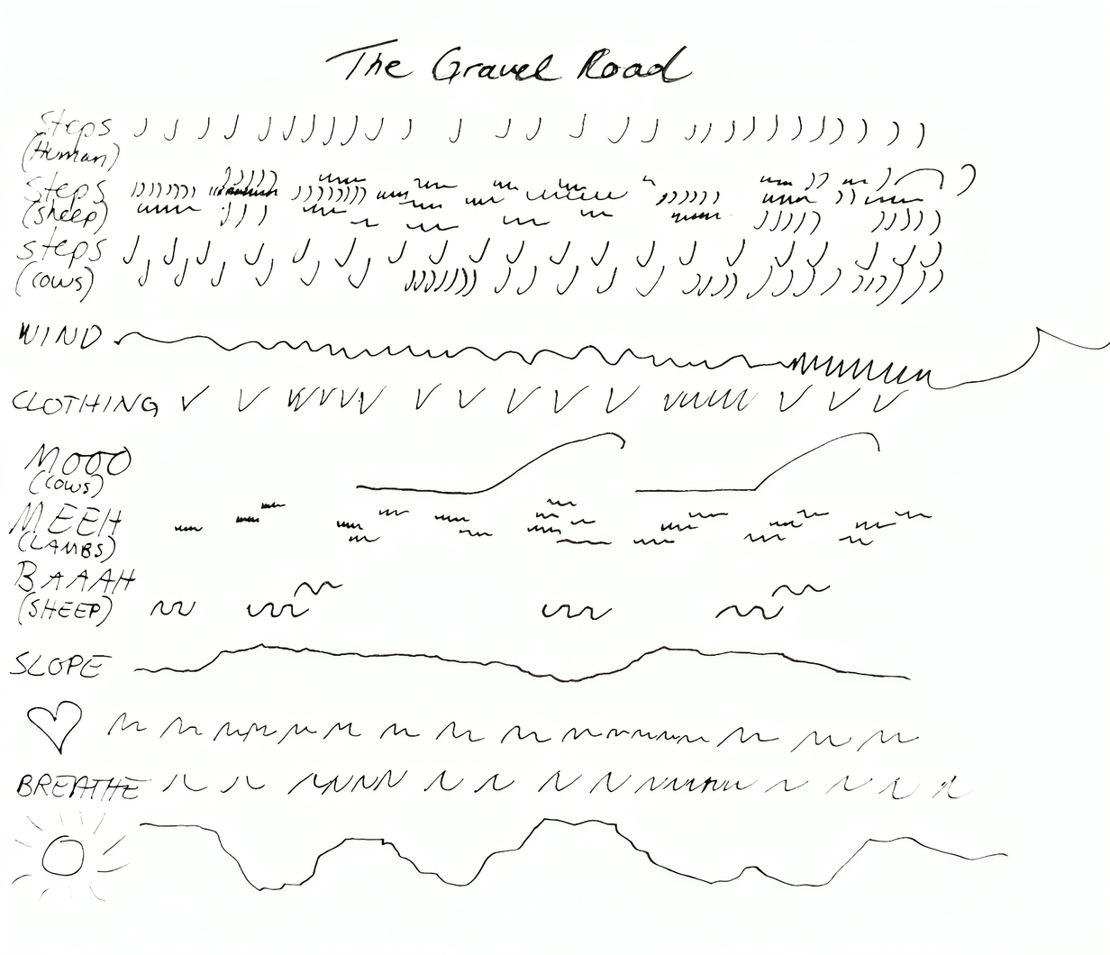 "We follow a gravel road. As I walk, my feet are gravitationally pulled towards the vibratory earth[1]. Each step produces a crackling sound when shoes meet sand and small pebbles. I find myself in the middle of many rhythms. Sudden increases of wind that take part in the rustling of leaves, the crackling sound of feet and soil, the comings and goings of clouds that hide the sun and its warmth, and the unpredictability of my breath due to the resistances offered by uphill, and downhill, slopes. Muscles get activated, flexed, and firm in tone with that which is encountered.