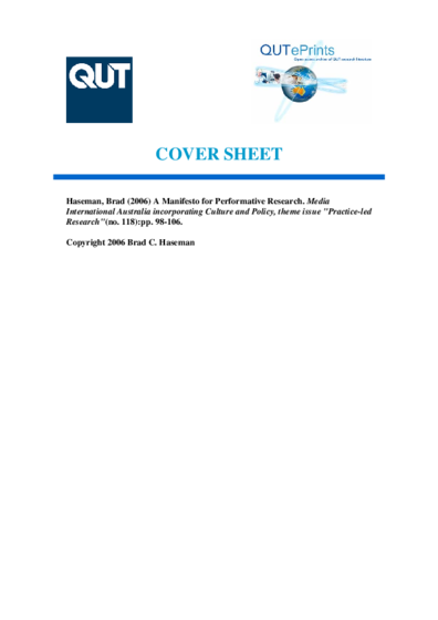 "Practice-led researchers construct experiential starting points from which practice follows. They tend to ‘dive in’, to commence practising to see what emerges. They acknowledge that what emerges is individualistic and idiosyncratic.This is not to say these researchers work without larger agendas or emancipatory aspirations, but they eschew the constraints of narrow problem setting and rigid methodological requirements at the outset of a project."