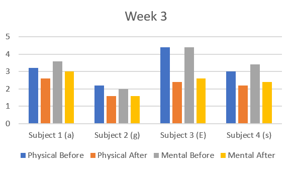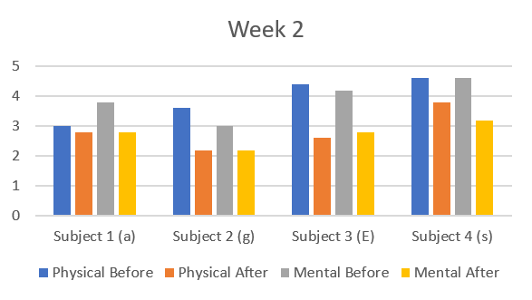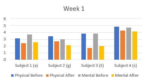 - In all of the weeks the average mental and physical stress scores went down after performing Applied Relaxation and Mindfulness.