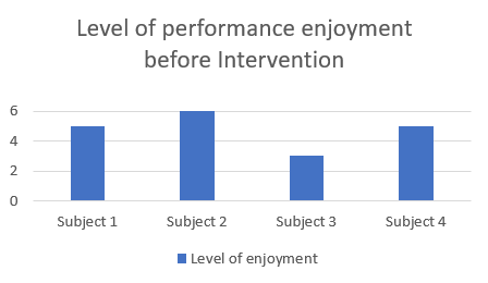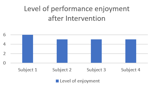 - It is interesting to indicate the improvement of the enjoyment levels on subject 3, which went from a 3/7 to a 5/7. He stated that he was still stressed during the performance, but the relaxed and welcoming atmosphere at the concert made him feel at ease.