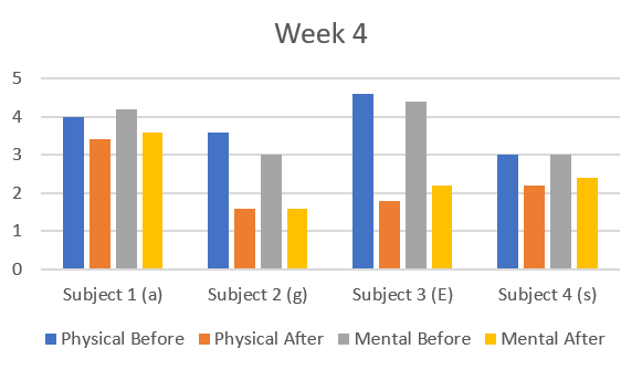 The logbook was used to measure the stress levels of the participants before and after the Applied Relaxation and Mindfulness exercises. The stress level indicated in the images below is the average of the subjects' stress scores during each of the four weeks.