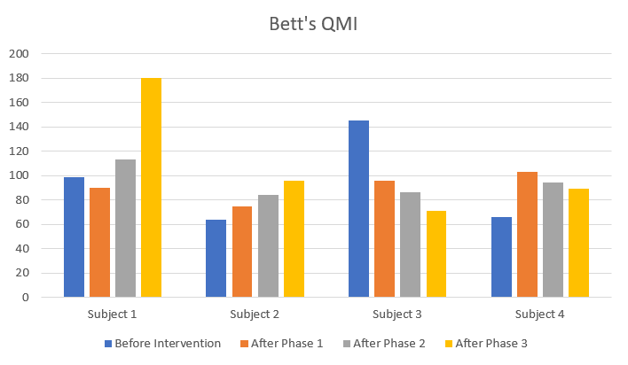 The Bett’s QMI helped track the mental skills of the subjects throughout the whole intervention and was our way to objectively see their improvements. These are the final scores of the 4 Questionnaires they filled. They were made before the intervention and after each one of the phases.