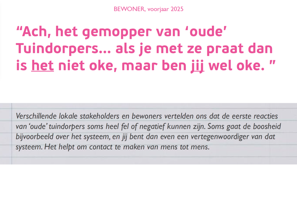 Een wijkbeheerder gaf aan dat de weerstand mogelijk meevalt omdat veel mensen in het hier en nu leven, en wellicht pas merken dat er iets gaat veranderen als ze bouwhekken zien.