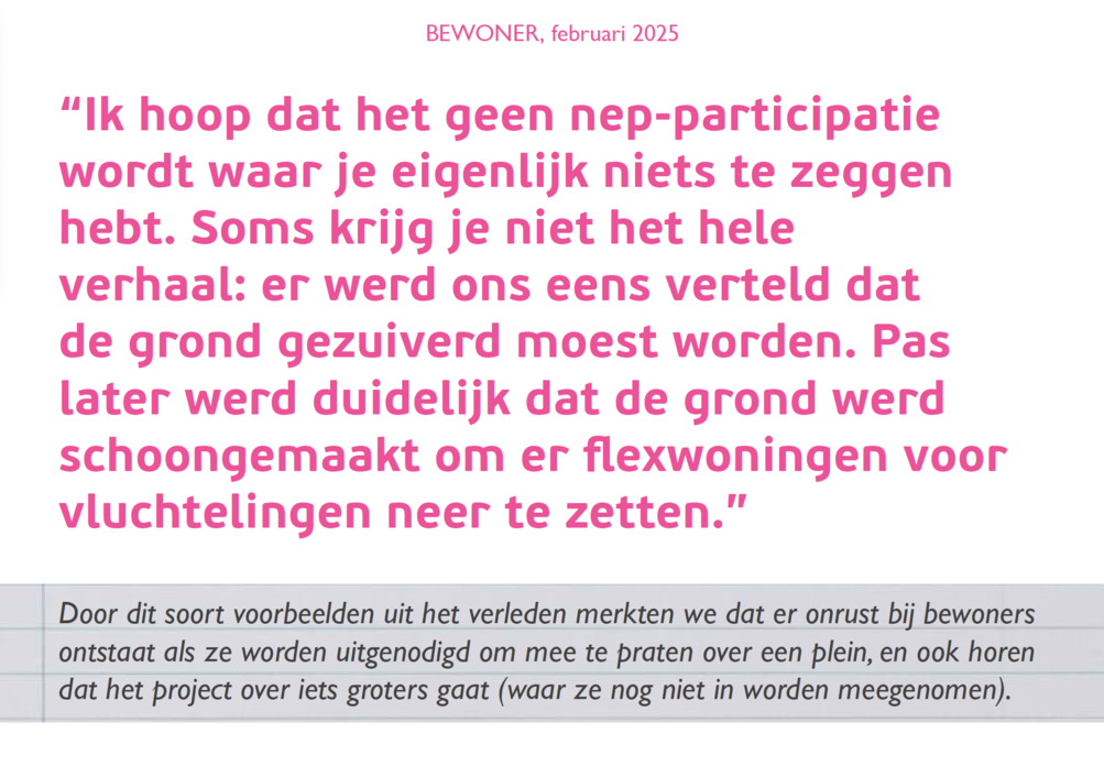 Door de negatieve ervaringen met eerdere participatietrajecten werd er voorafgaand aan dit project geanticipeerd op weerstand uit de buurt. Bewoners merkten een voorzichtigheid bij de startbijeenkomst: “Het klonk alsof er veel verzet verwacht werd. Het werd een verhaal van ‘samen’, en we gaan met de bewoners praten.”