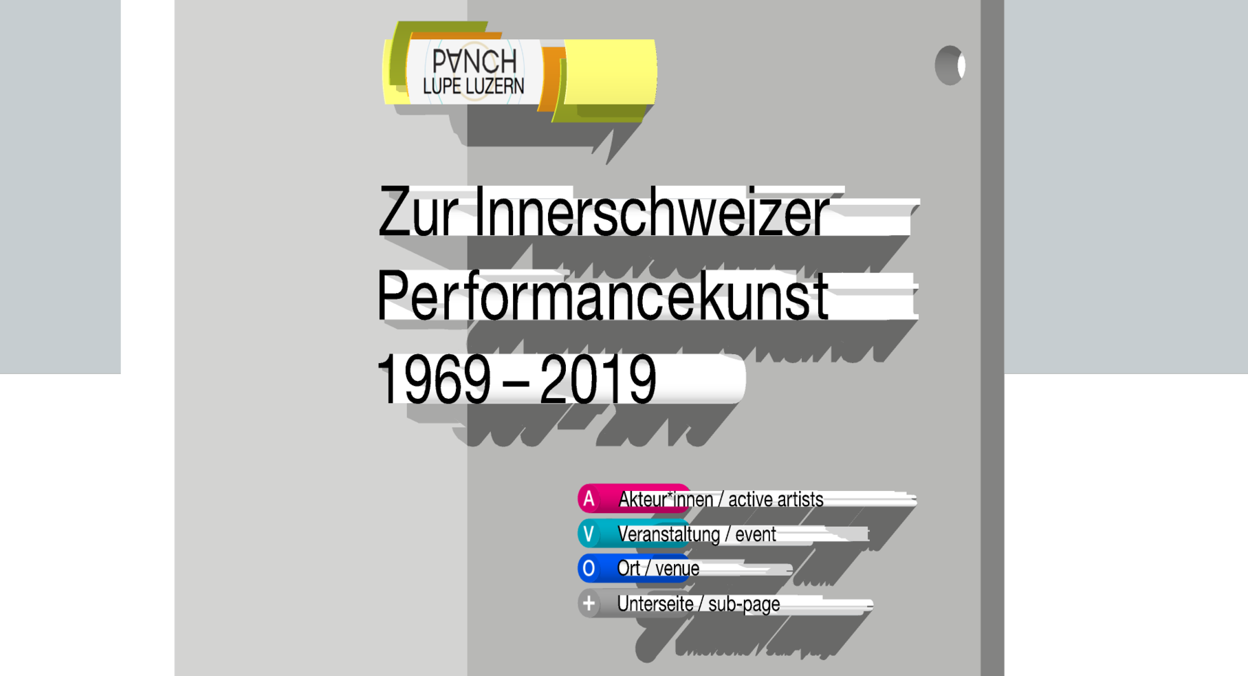 The PANCH Lupe Luzern website depicts the performance art scene of Central Switzerland as a cartography or “Archaeology” of the half-century between 1969 and 2019, including a collection of pictures, texts, news articles and other materials. The "Interviews" section provides historical insights into both the past and the present scenes, published as audio files supplemented by digests. The "Actors" listing assembles artists, organizers, and venues that were active in the timespan from 2017 to 2019. The category “Snapshots” collects the traces of performance art events held over the same time period.