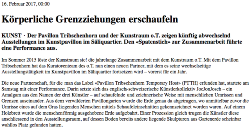 - 8. Februar 2017 >happen< Performance-Abend mit Monica Germann, Daniel Häller, Judith Huber, Adrian Hossli, Laura Laeser, Dominik Lipp, Rochus Lussi.