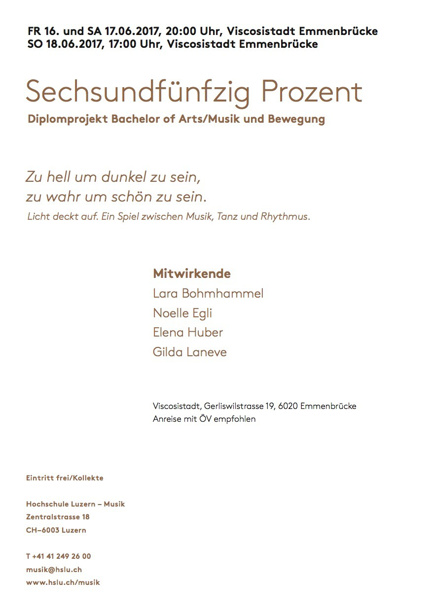16. -18. Juni 2017, Viscosistadt Emmenbrücke: Sechundfünfzig Prozent, Diplomprojekt Bachelor of Arts/Musik und Bewegung