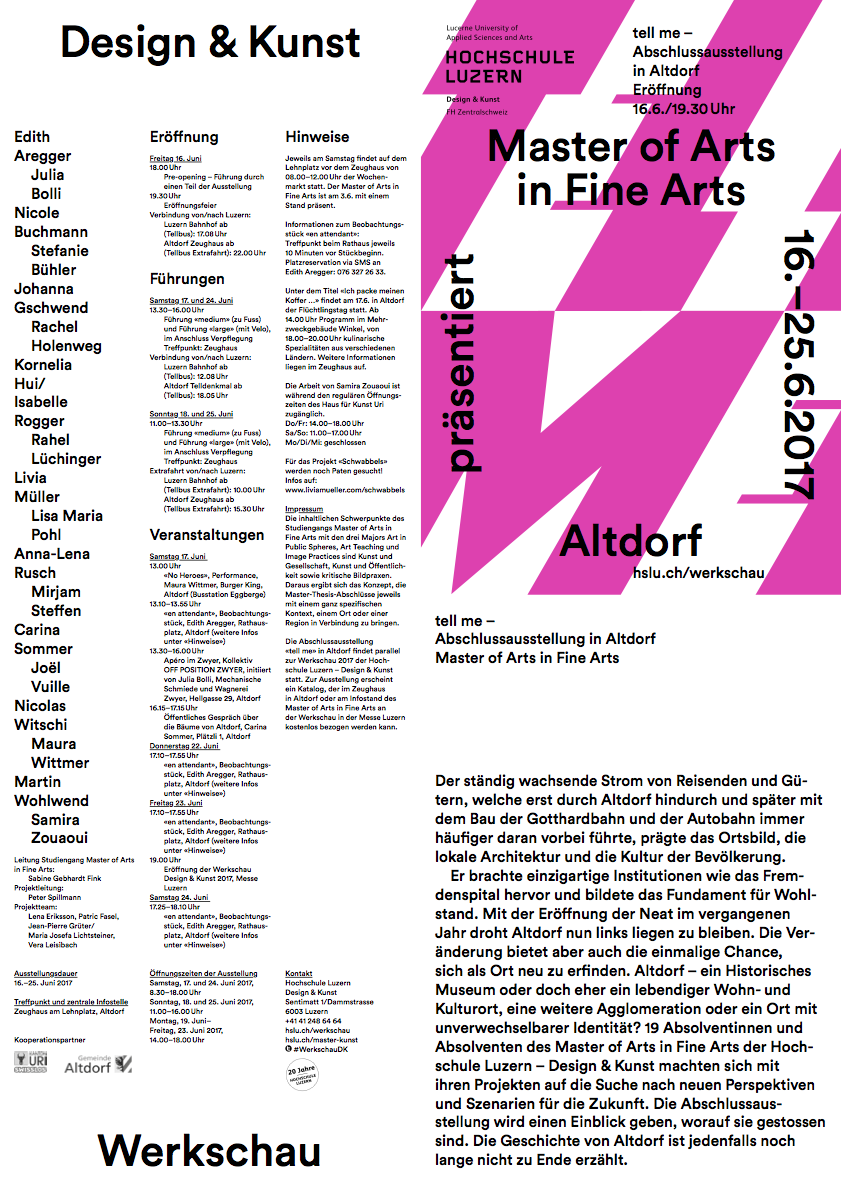 16. - 25. Juni 2017, Zeughaus am Lehnplatz, Altdorf: tell me, Abschlussausstellung Master of Arts in Fine Arts
