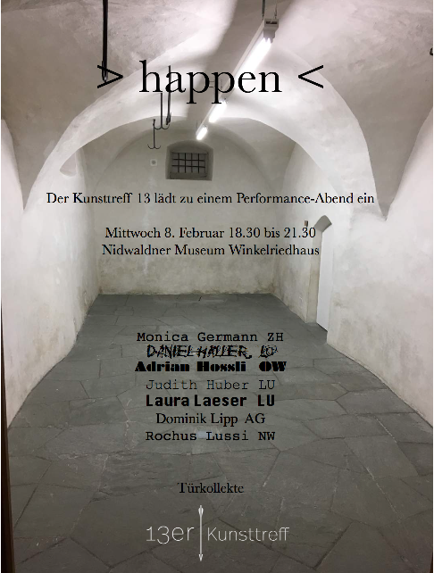 - 8. Februar 2017 >happen< Performance-Abend mit Monica Germann, Daniel Häller, Judith Huber, Adrian Hossli, Laura Laeser, Dominik Lipp, Rochus Lussi.