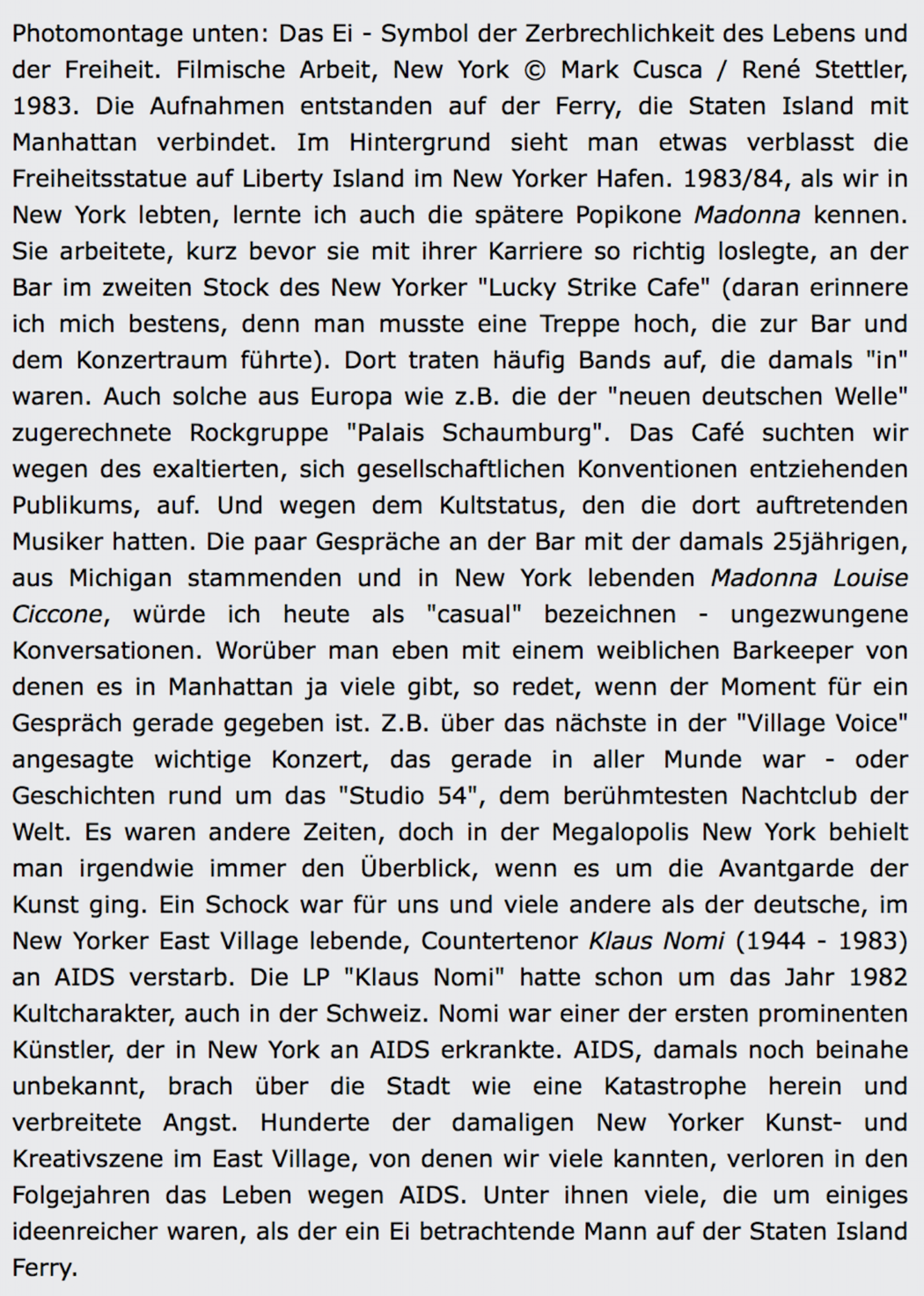 New York 1983 - Super-8-Film (Film Stills) aus dem Film "Ich und das Ei" von R. Stettler und M. Cusca - Text R. Stettler -