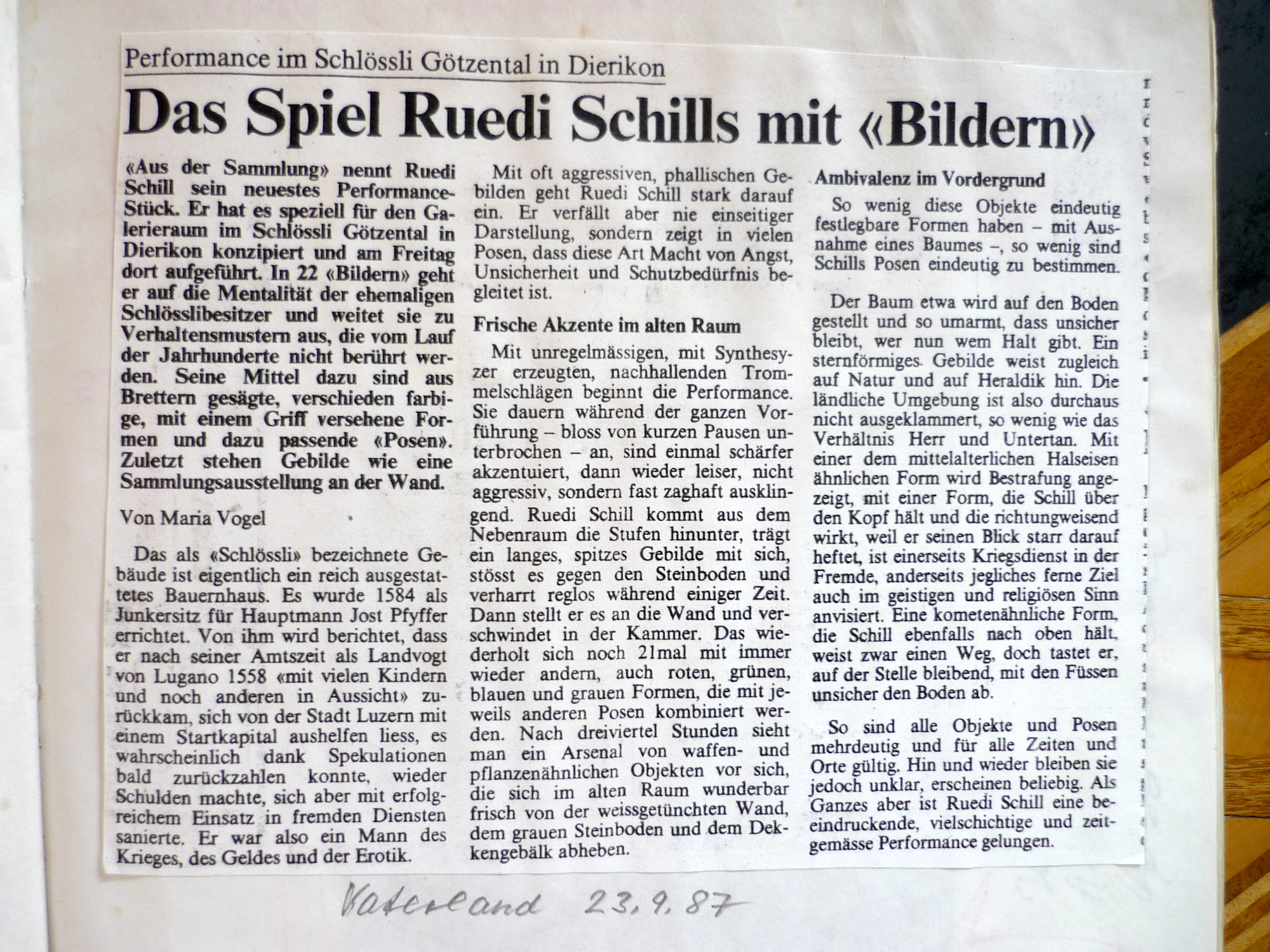 Das Spiel Ruedi Schills mit "Bildern" - Bericht Vaterland - Maria Vogel - 23.9.87